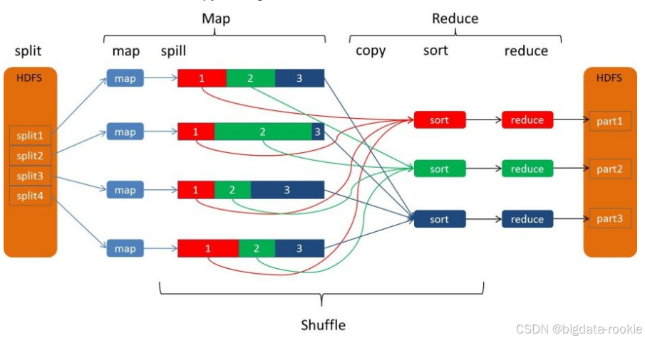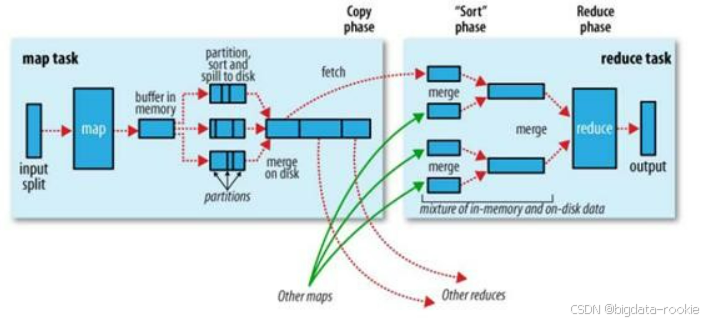 - reduce task 从每个 map task 的结果文件中拉取对应分区的数据。因为数据在 map 阶段已经分好区了,并且会有一个额外的索引文件记录每个分区的起始偏移量,所以 reduce task 取数的时候直接根据偏移量去拉取数据就可以;