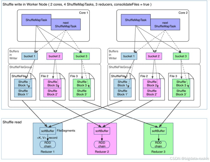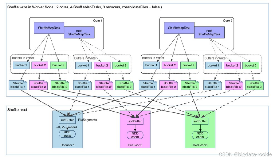 普通机制的 Hash shuffle 会产生大量小文件,对文件系统的压力很大,也不利于 I/O 的吞吐量,后面做了优化(设置spark.shuffle.consolidateFiles=true开启,默认false),优化后的 Hash shuffl 把在同一个 core 上的多个 Mapper 输出到同一个文件,这样文件数就变成了 core * R 个。如下图所示:2 个 core,4 个 map task,3 个 reduce task,会产生 2*3=6 个小文件。