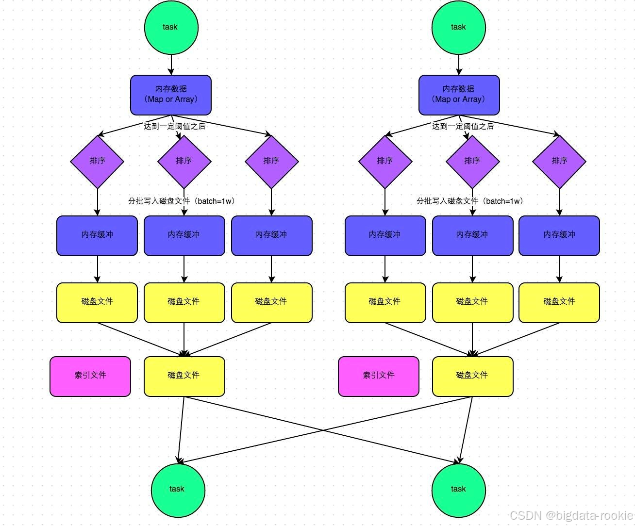一个 task 将所有数据写入内存数据结构的过程中,会发生多次磁盘溢写操作 ,也会产生多个临时文件。最后会将之前所有的临时文件都进行合并,由于一个 task 只对应一个文件,因此还会单独写一份索引文件,记录下游各个 task 的数据在文件中的 start offset 和 end offset。