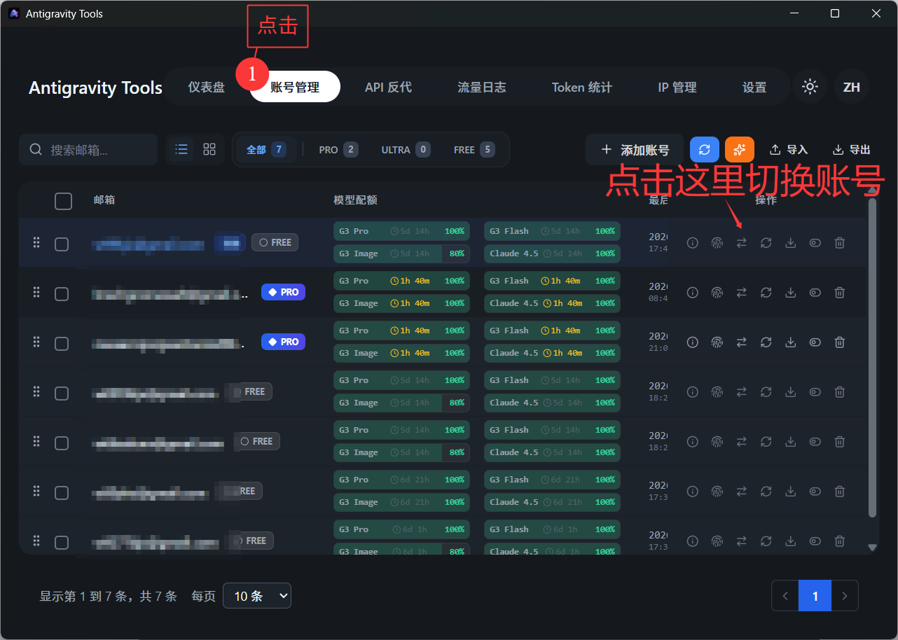 下图中 7 个账号中的 5 个免费账号,都通过下面的步骤,操作后成功登录使用。