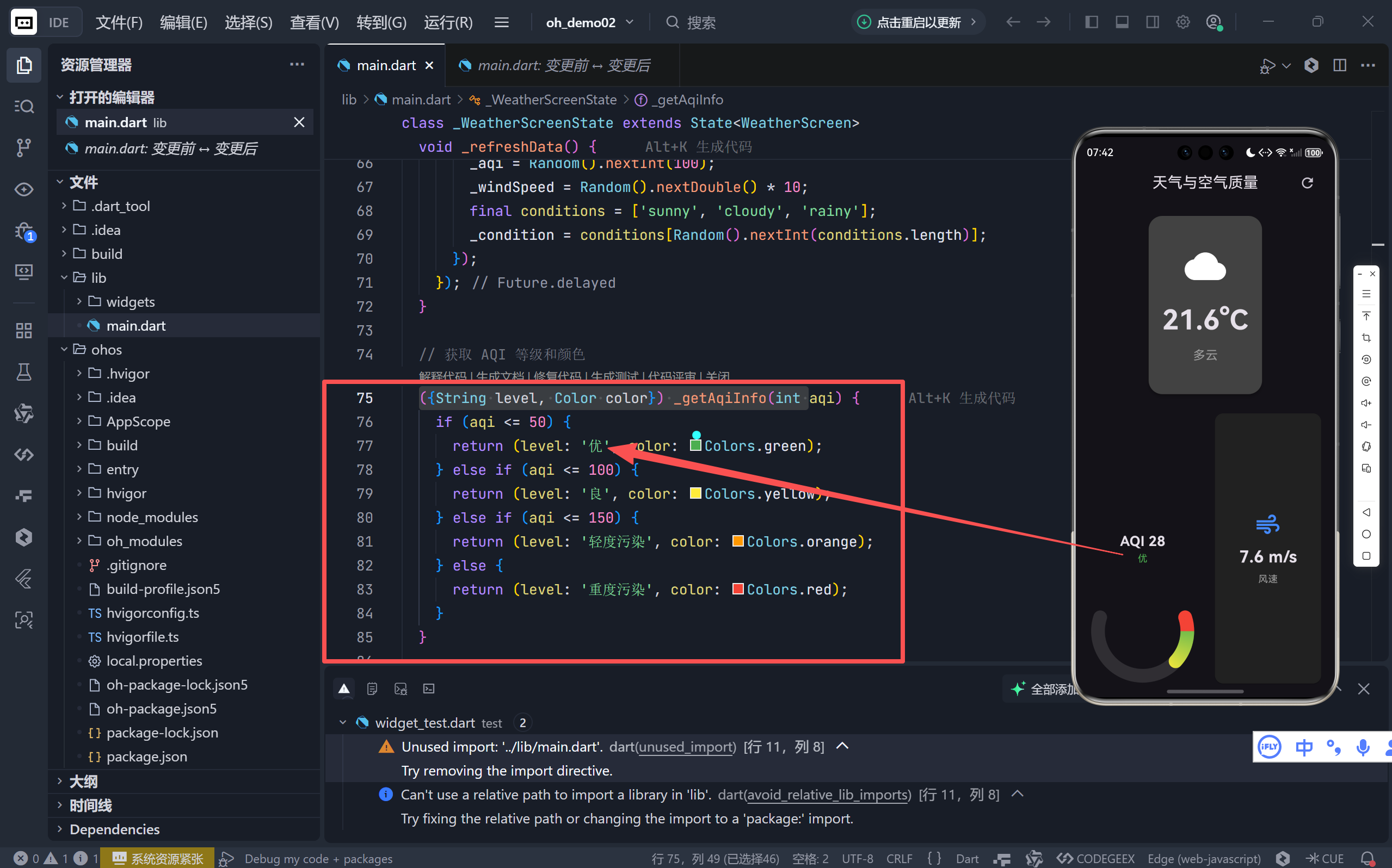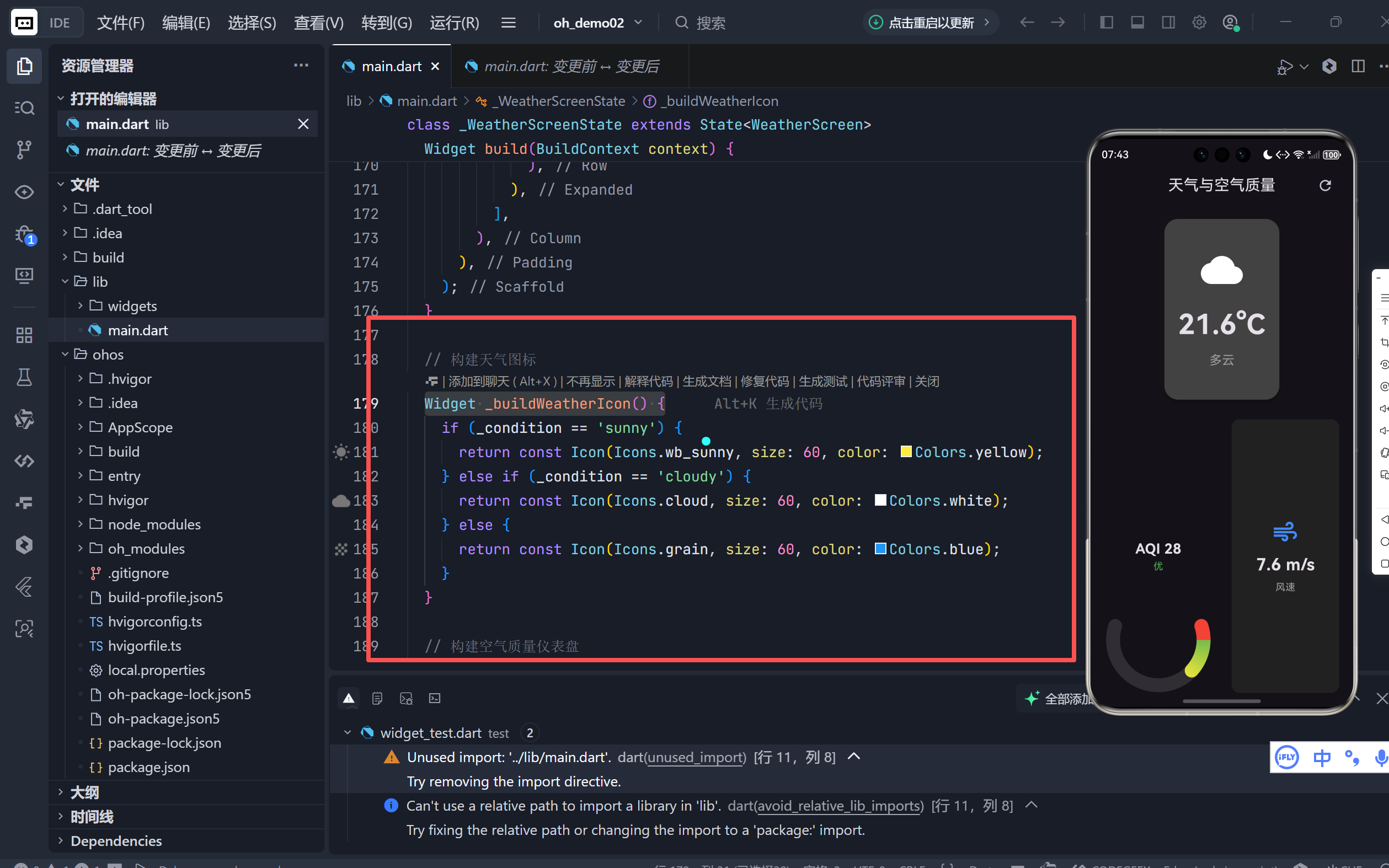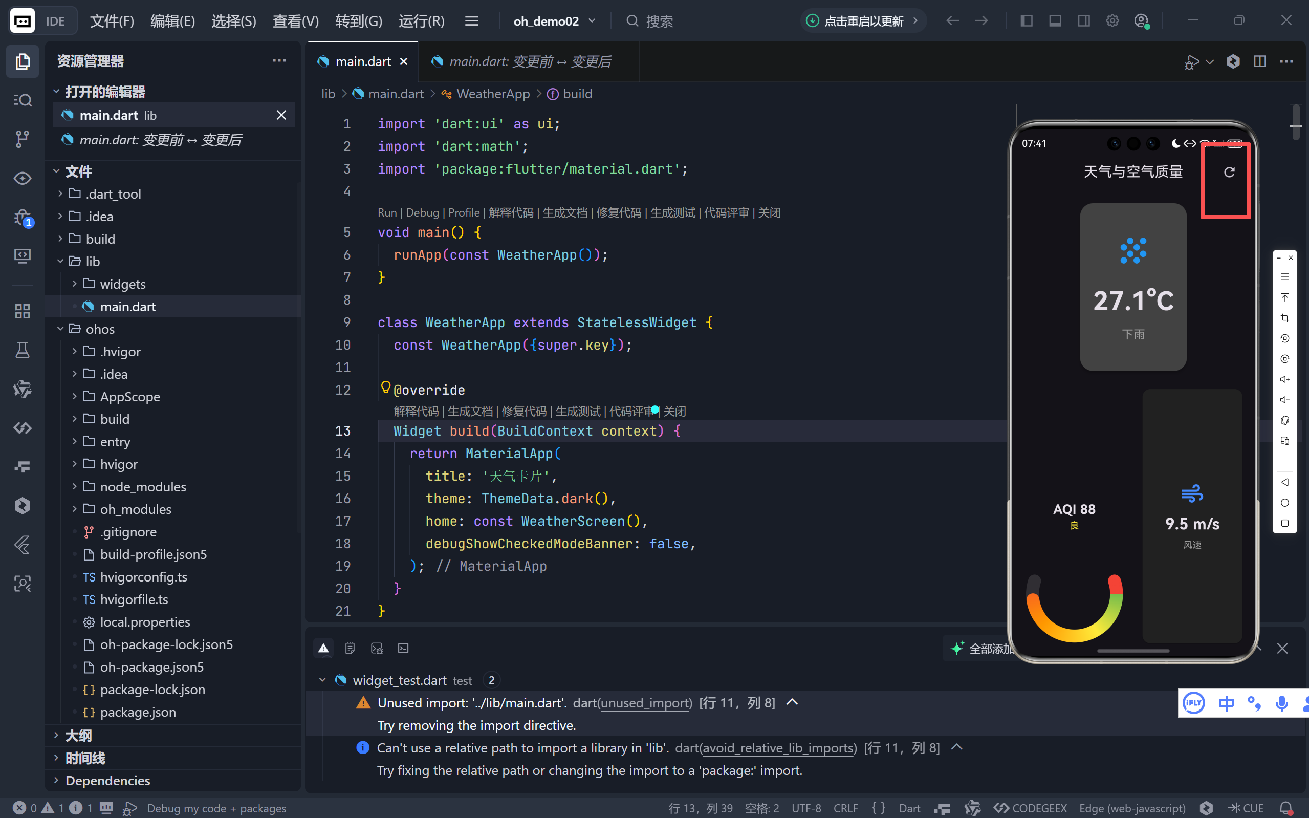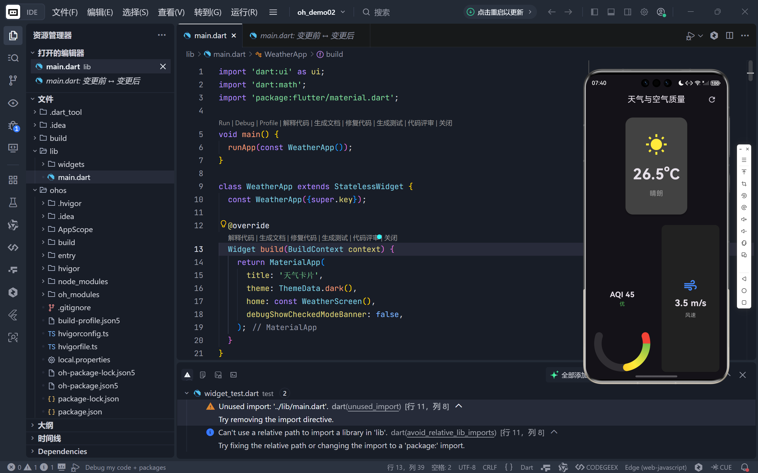代码,展示如何构建一个兼具动态刷新、视觉反馈和信息聚合能力的天气与空气质量卡片应用。