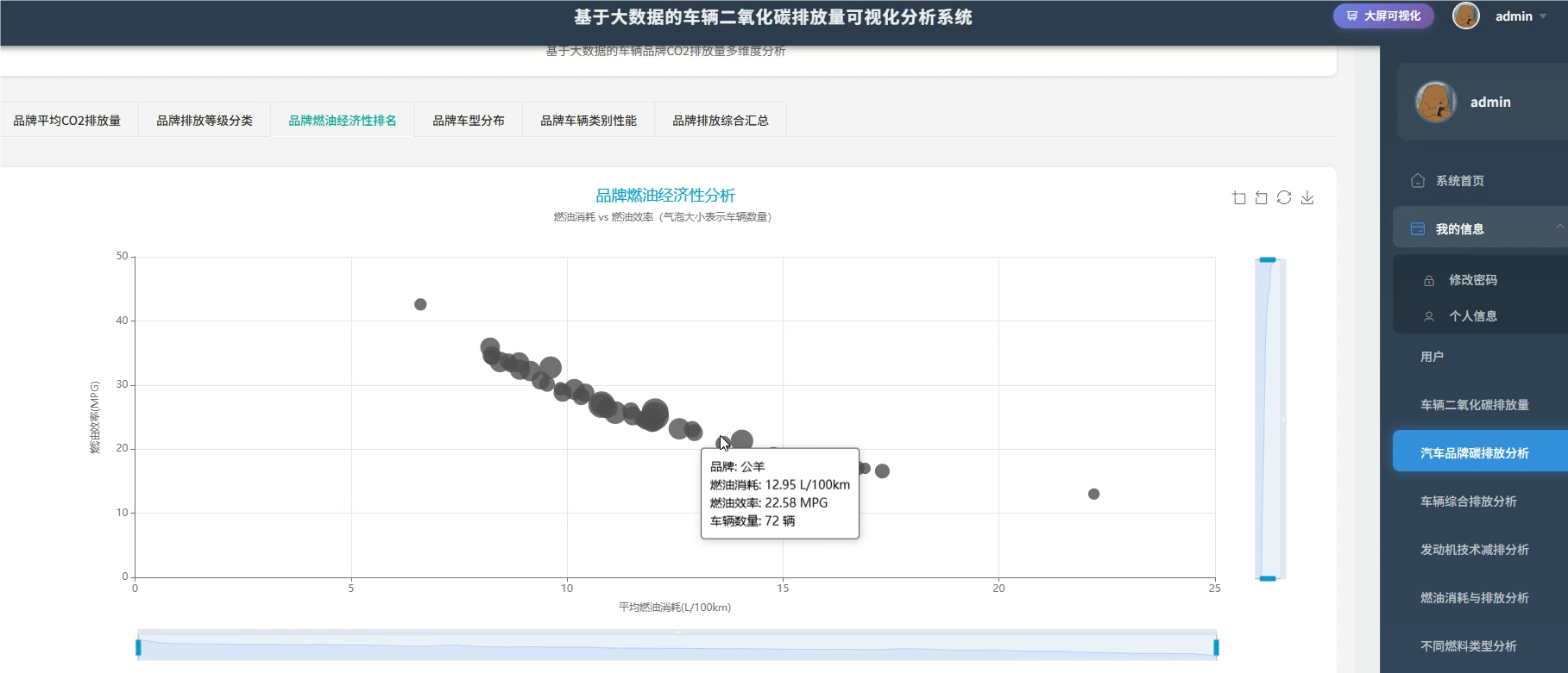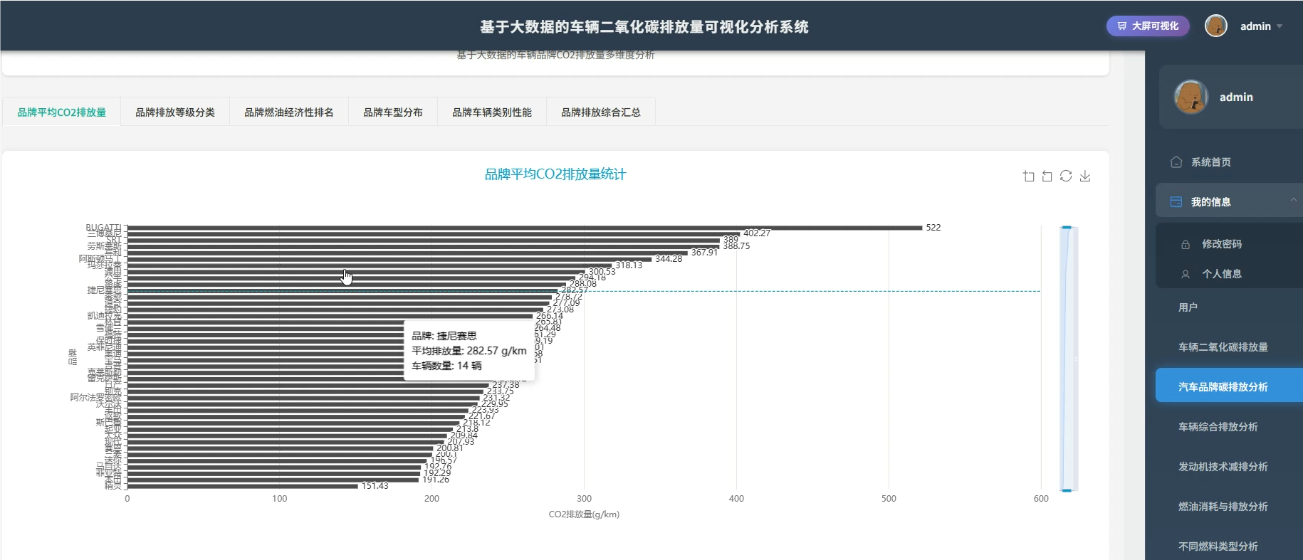 总结:本系统设计并实现了一个基于大数据的车辆二氧化碳排放量可视化分析平台,利用Spark大数据处理框架,对车辆的多维度数据进行了深入的清洗、分析和挖掘。通过对品牌、车型、发动机技术及燃料类型的综合评估,系统成功揭示了各因素对碳排放的具体影响规律,并利用聚类和预测模型识别了高排放车辆特征及关键影响因子。整个项目从实际需求出发,构建了从数据接入到可视化展示的完整流程,不仅验证了大数据技术在环保领域的应用价值,也为车辆排放评估提供了一种科学、高效的分析手段。虽然系统在数据广度和算法复杂度上还有提升空间,但作为毕业设计,它基本达到了预期目标,能够为相关决策提供参考,同时也展示了处理和分析实际业务数据的能力。