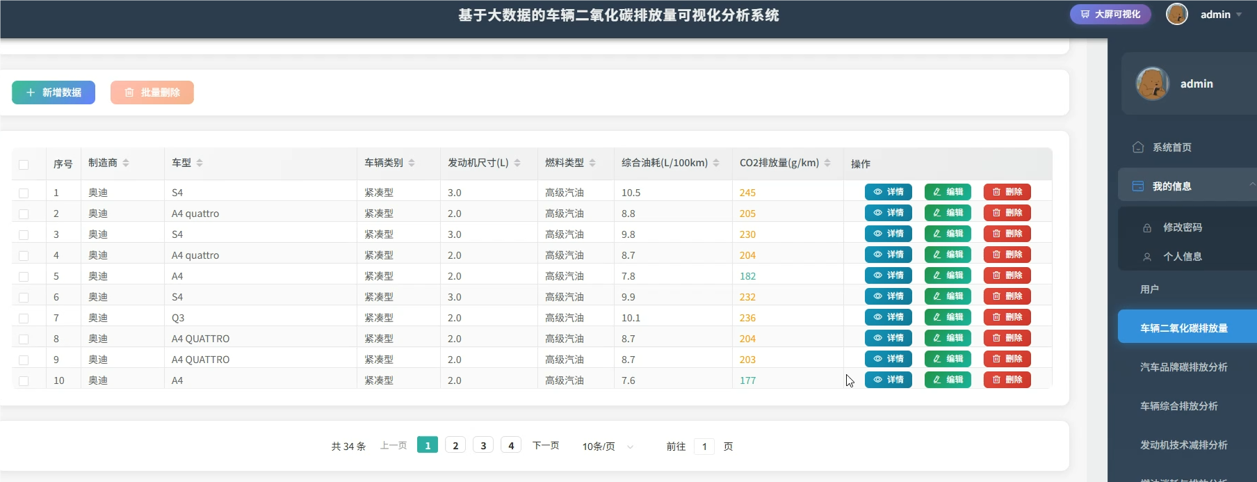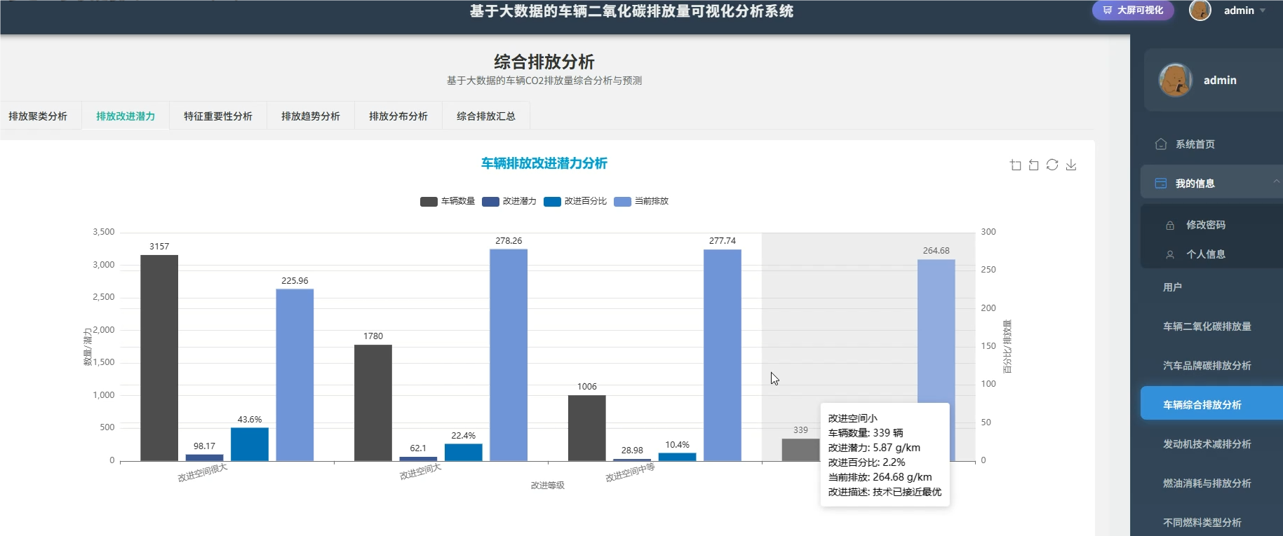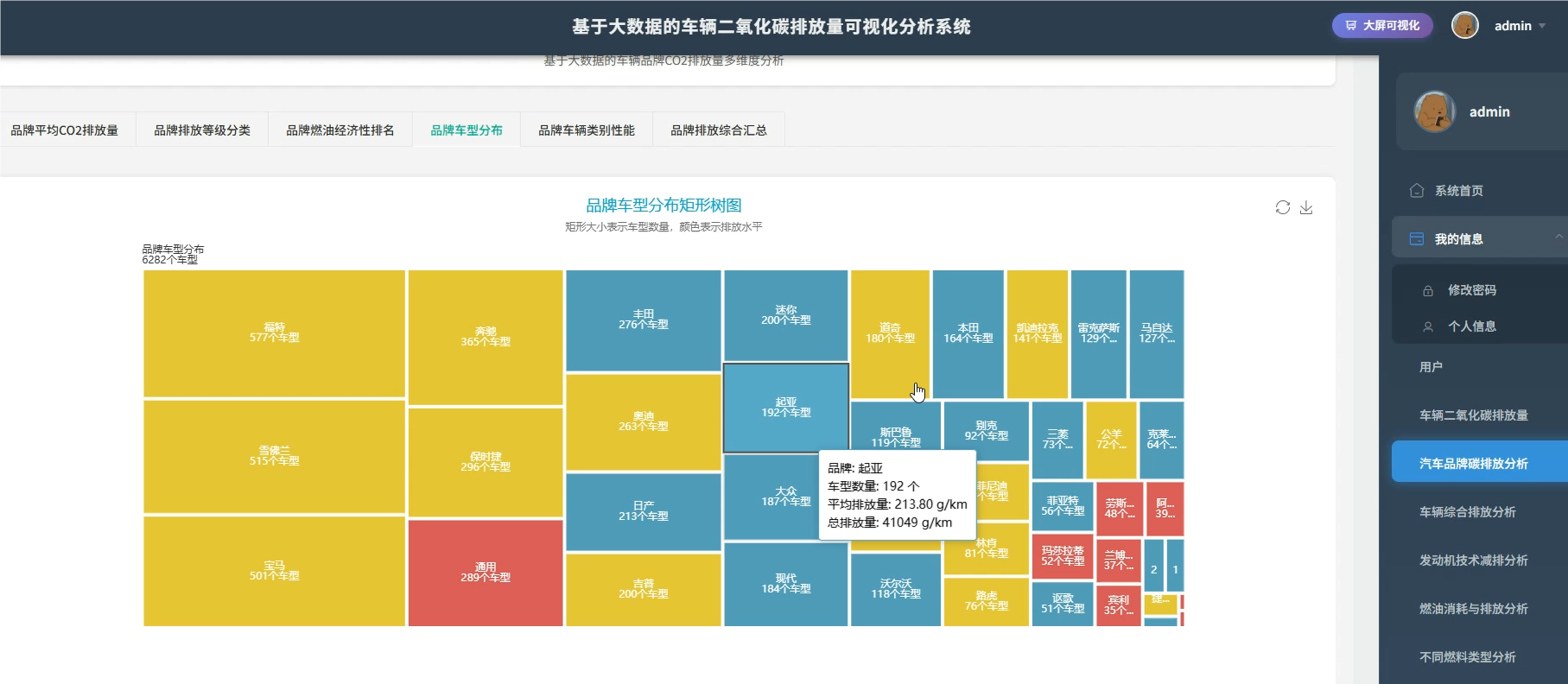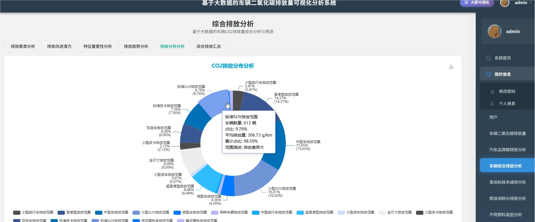 选题背景:随着全球气候变化问题日益严峻,汽车尾气排放作为主要的空气污染源之一,引起了社会各界的广泛关注。在"双碳"目标的背景下,如何有效监测和控制车辆碳排放成为了亟待解决的重要课题。传统的车辆排放研究往往依赖于小规模的抽样调查或简单的统计报表,难以全面反映真实路况下的排放水平。目前,虽然积累了大量的车辆技术参数和排放数据,但缺乏有效的工具对这些数据进行深度整合与多维度分析。现有的管理系统大多侧重于基础信息的录入,缺乏对排放规律、燃油经济性以及不同技术组合对环境影响的分析能力,导致数据价值未被充分挖掘,无法为环保部门制定精准政策提供强有力的科学依据。