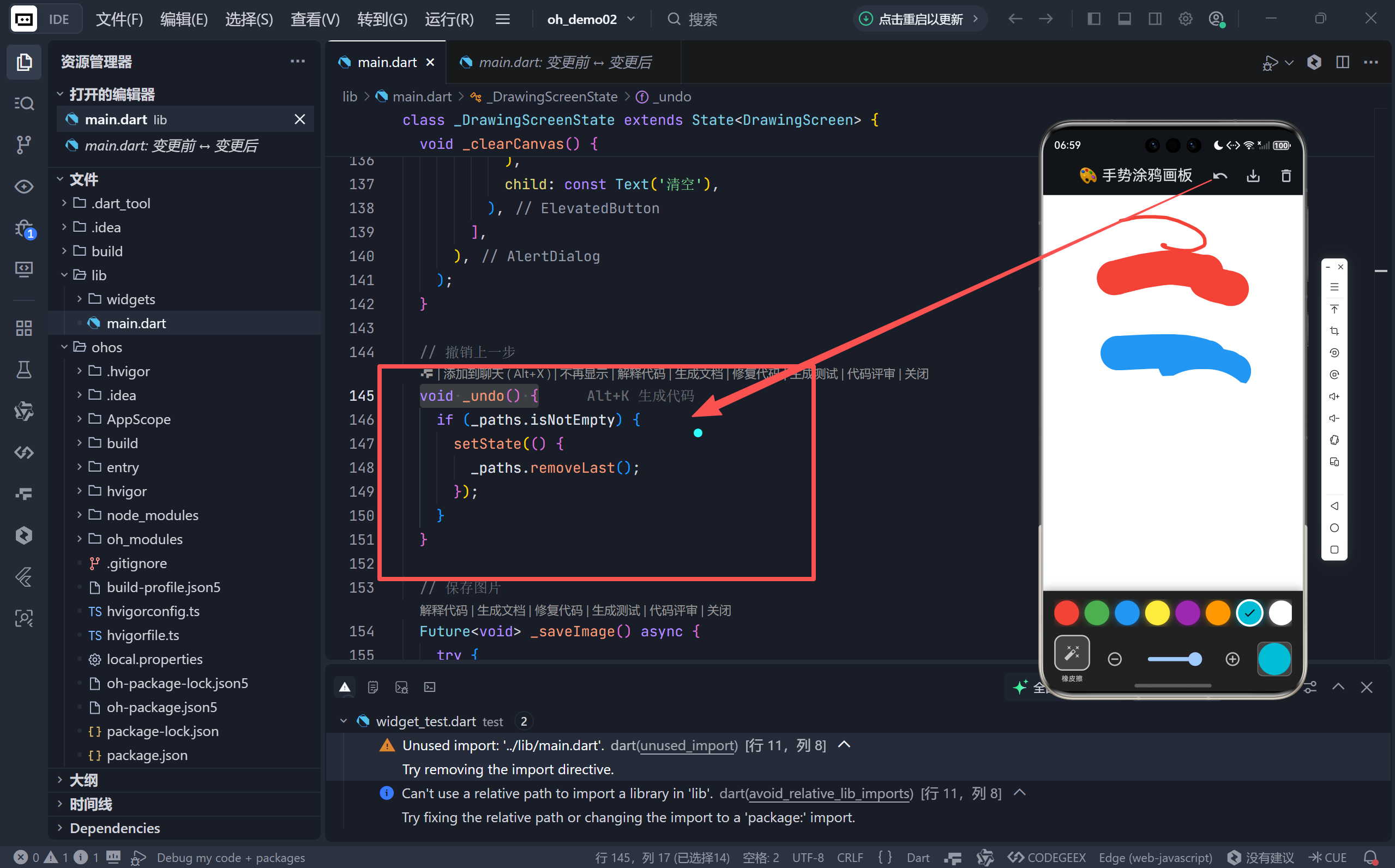 我们的目标是创建一个可以自由绘制的画板应用,用户可以通过手势在屏幕上绘画,并能选择不同的颜色、调整画笔的粗细,使用橡皮擦,以及撤销上一步操作或清空整个画布。此外,用户还可以将他们的作品保存为图片到本地相册。