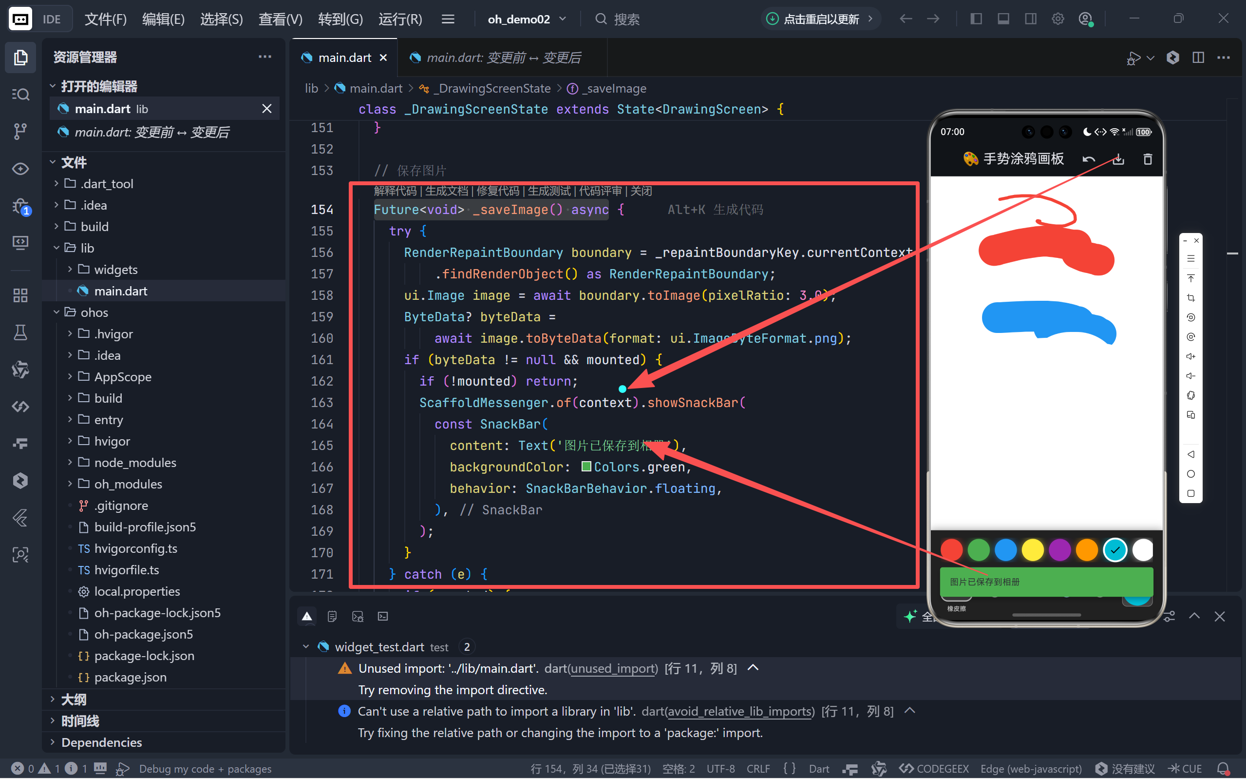利用 RepaintBoundary 和 toImage 方法,我们可以轻松地将当前绘制的内容转换为图片格式并保存至本地相册。首先,我们需要给需要截图的部分分配一个全局键 _repaintBoundaryKey,然后调用 toImage 方法生成图像数据,最后通过 ByteData 将图像数据写入文件系统。