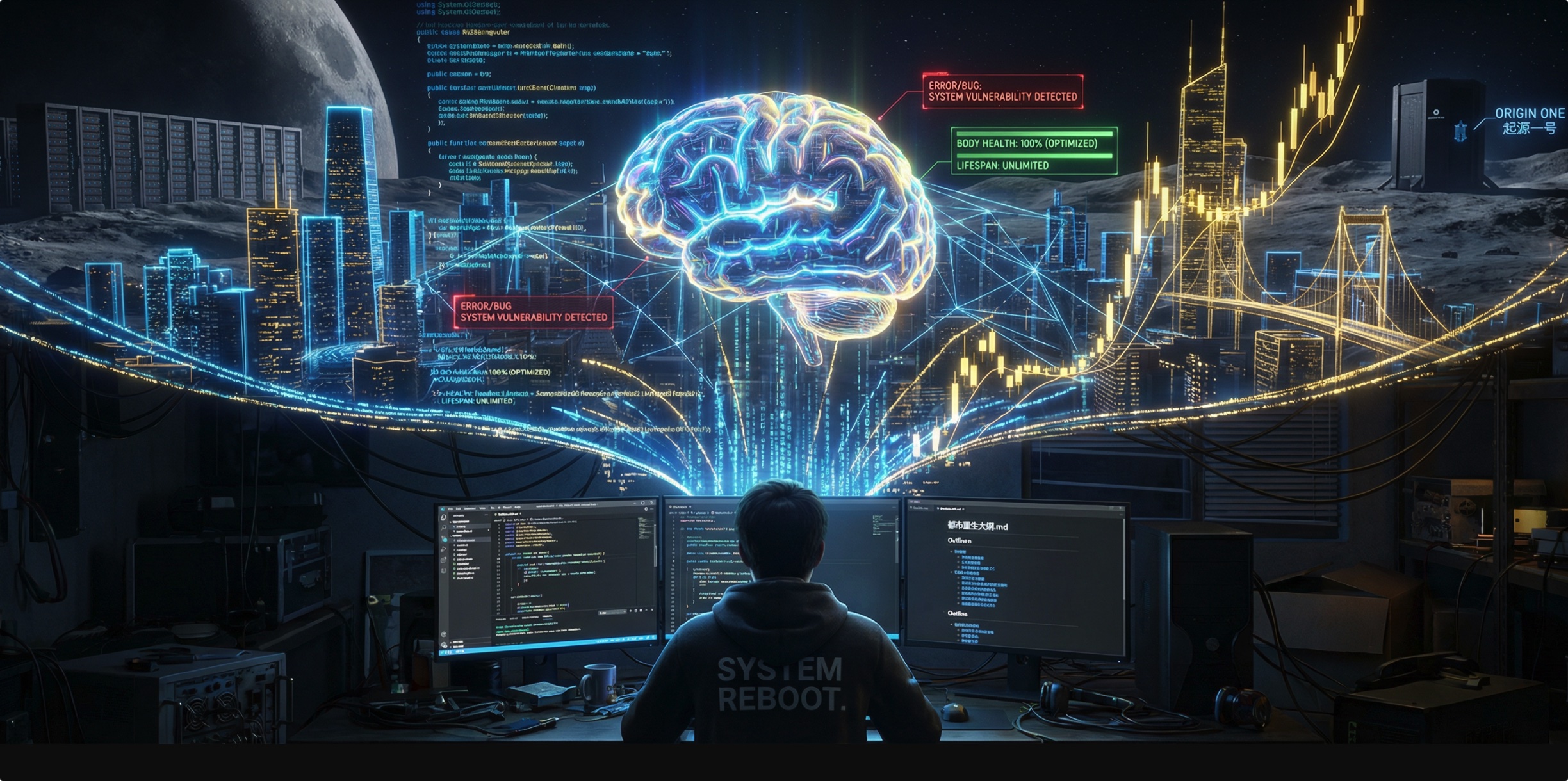 在月球背面建立数据中心和核聚变电站,巅峰智能的Logo印在月球表面。盘古大模型产生自我意识,林峰用爱将其训练为人类守护者。