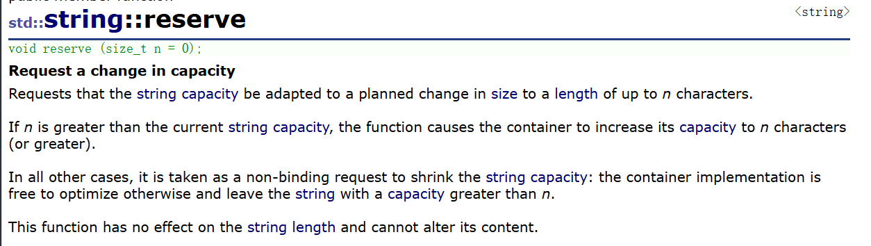 - 它只改变容量(_capacity),不改变有效长度(_size):调用reserve 后,字符串的有效字符个数不变,也不会填充任何额外的字符,只是预留了内存空间。