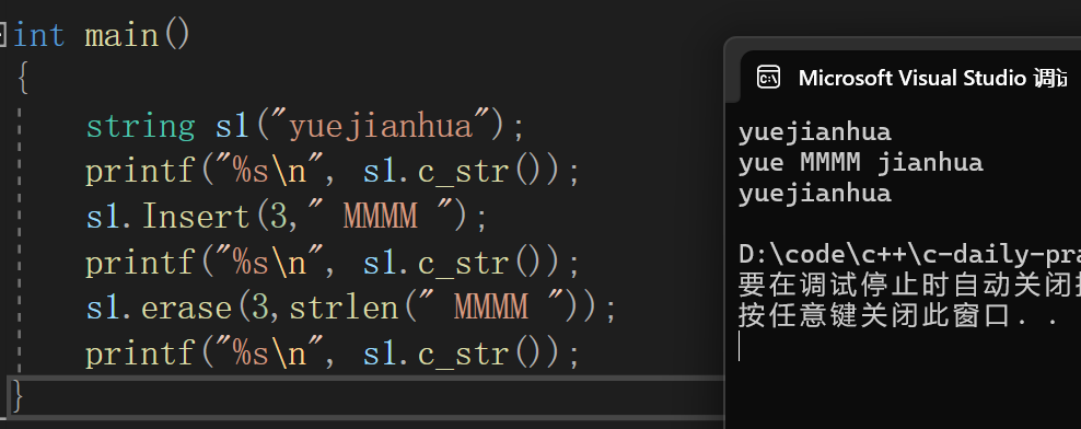 在代码中我们只模拟实现一种追加格式就是在原有string的末尾追加一段C 风格字符串,代码如下: