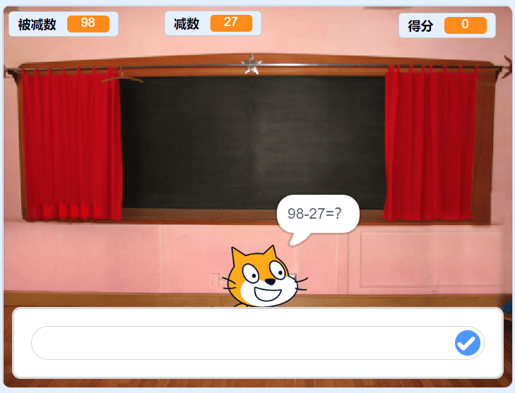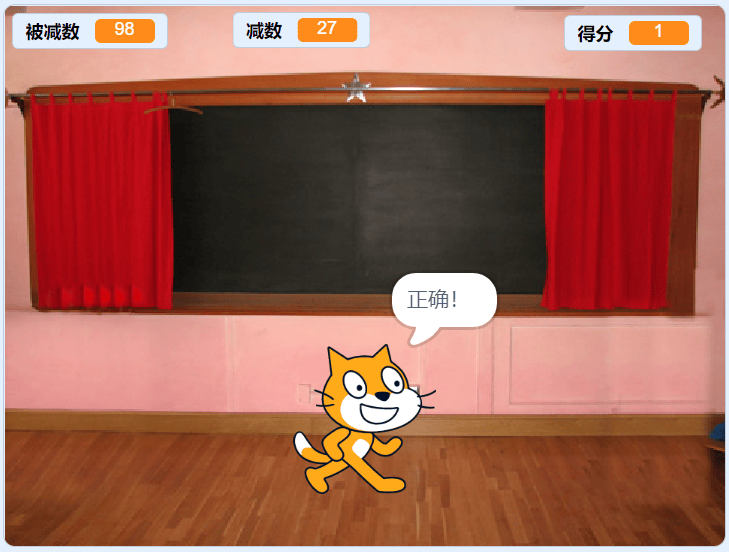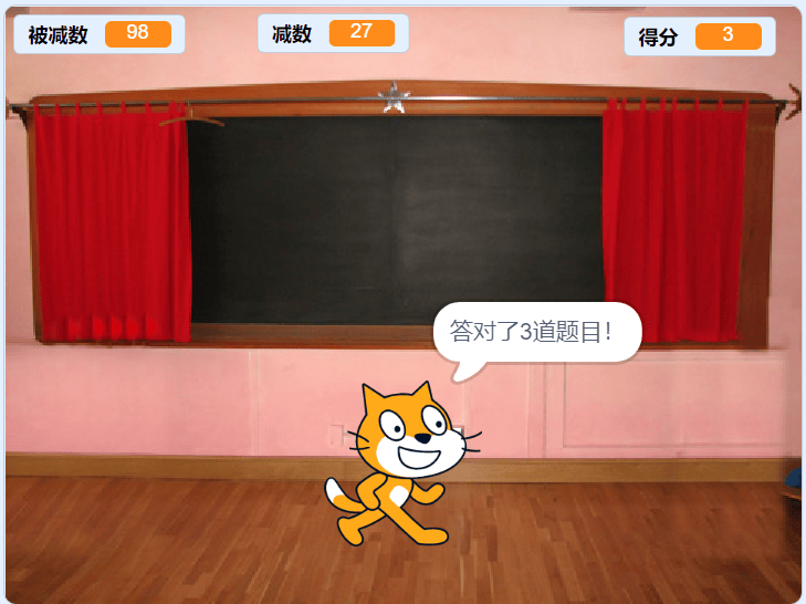 (3)输入答案,答对了,得分加1,小猫说"正确"2秒,否则说"错误"2秒。