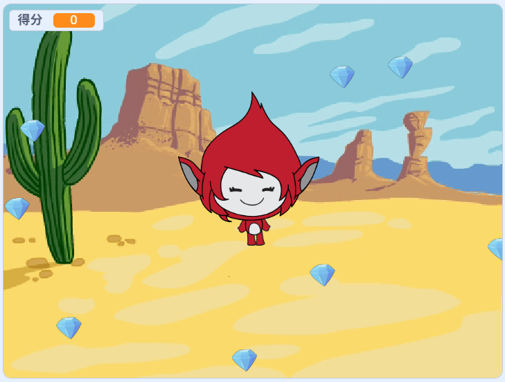 (4)等待2秒后,小精灵跟随鼠标移动,钻石碰到小精灵,得分增加1,钻石消失;