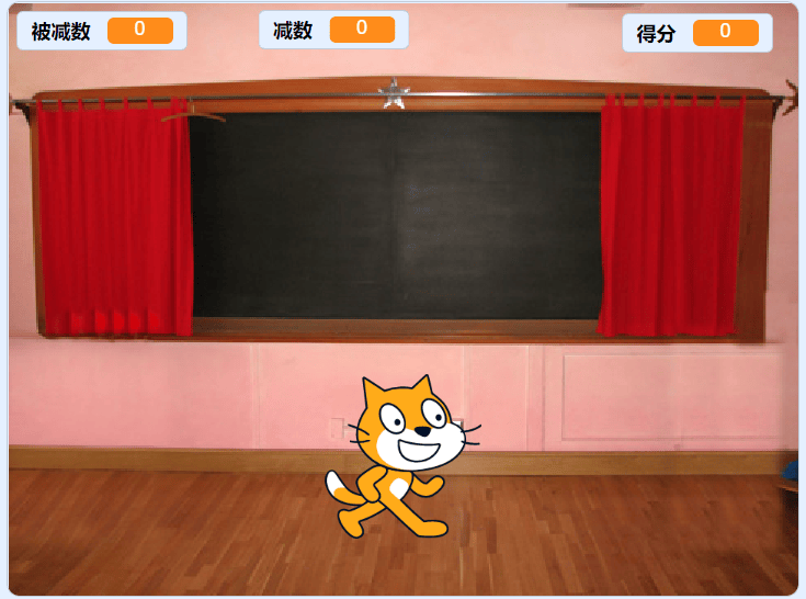(2)点击绿旗,将变量"被减数"设为在50和100之间取随机数,将变量"减数"设为在10和50之间取随机数,小猫询问:"被减数-减数=?",例如: "98-27=?";