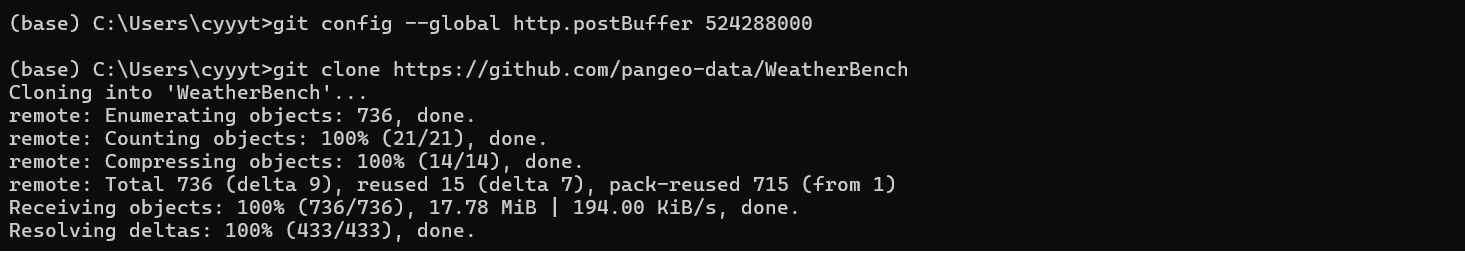 认为可能是仓库较大导致报错,于是设置更大的 postBuffer (缓冲区大小),最终成功克隆: