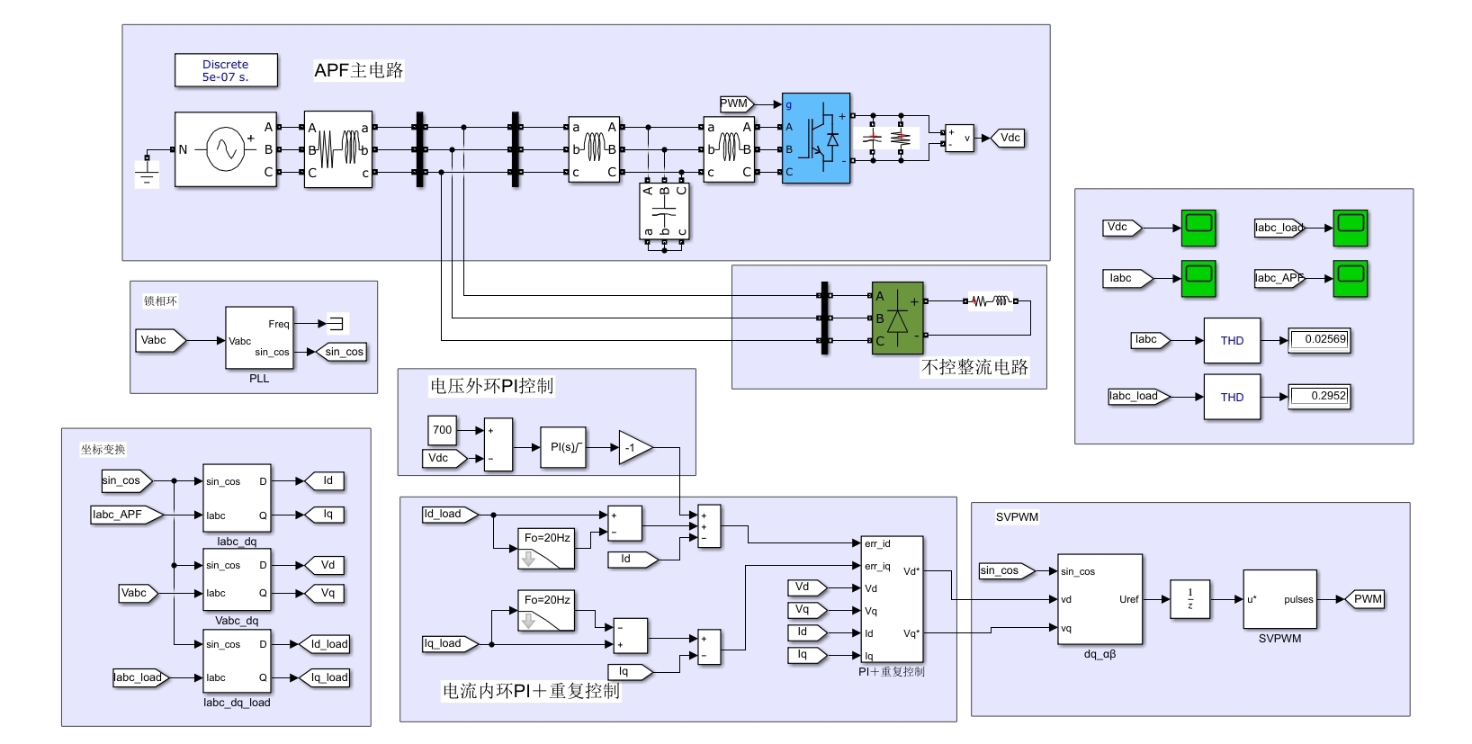三相APF有源电力滤波,电流内环PI控制+重复控制,电压外环PI控制,idiq谐波检测,svpwm调制,电网电流THD3%以内。