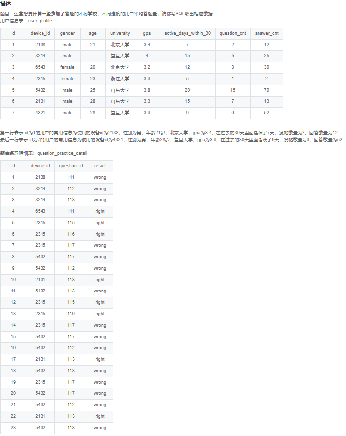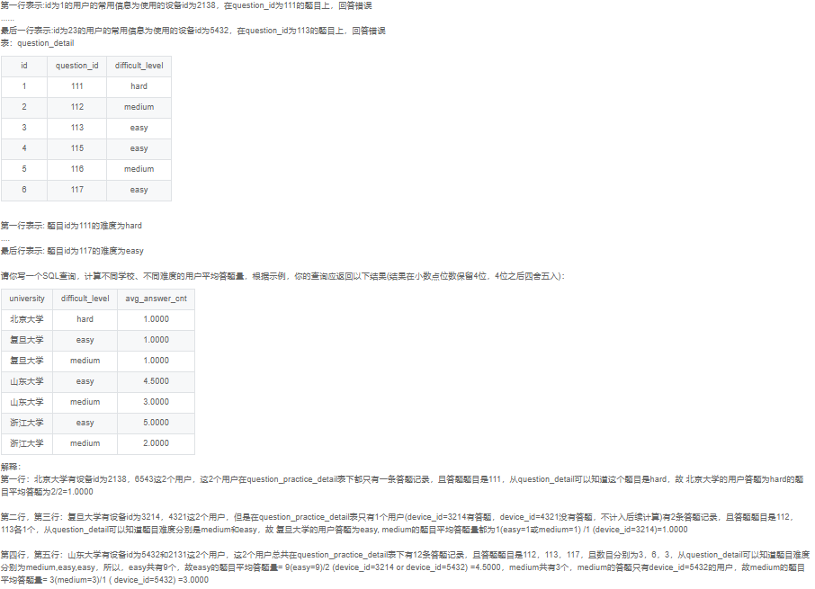 FROM user_profile u:从用户信息表开始查询,并给表起别名uJOIN question_practice_detail qpd ON u.device_id = qpd.device_id:通过device_id(用户唯一标识)把用户表和答题记录表关联起来,这样就能知道每个用户做了哪些题JOIN question_detail qd ON qpd.question_id = qd.question_id:通过question_id(题目唯一标识)把答题记录表和题目详情表关联起来,这样就能知道每道题的难度