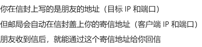 服务端收到客户端 的信息后 ,就通过数据包中的ip和端口 将响应发送给客户端
