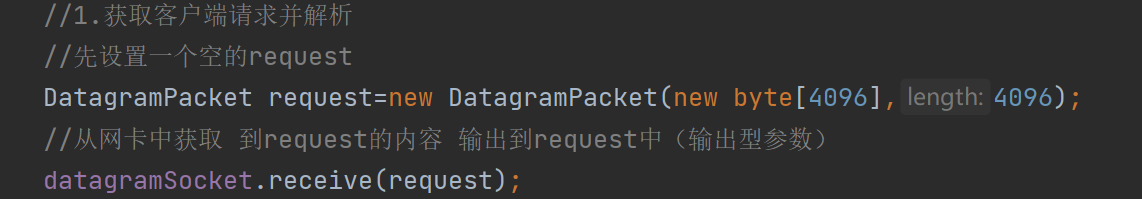 3.设置一个request数据包 利用receive方法来获取到客户端发送的消息 为什么说request是输出型参数 ,大家可以类似理解为最初request是空的 但是经过receive函数 request被赋予了值,这个值就是客户端发送的,物理介质就是网卡