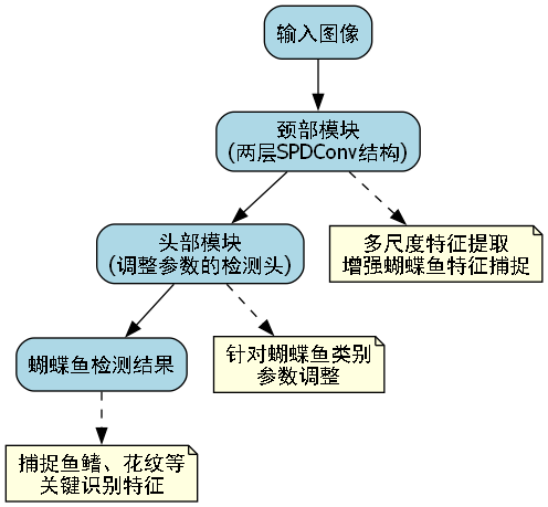 上述代码展示了改进后的颈部和头部模块。颈部模块引入了两层SPDConv结构,通过多尺度特征提取增强对蝴蝶鱼特征的捕捉能力;头部模块则保持了原有的检测头设计,但针对蝴蝶鱼的类别数量进行了参数调整。在实际训练中,这种架构调整使模型能够更好地捕捉蝴蝶鱼的细微特征,特别是鱼鳍、花纹等关键识别特征。