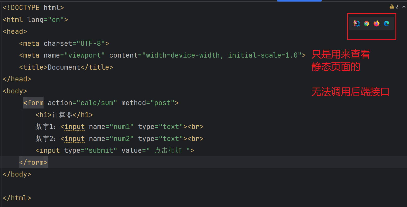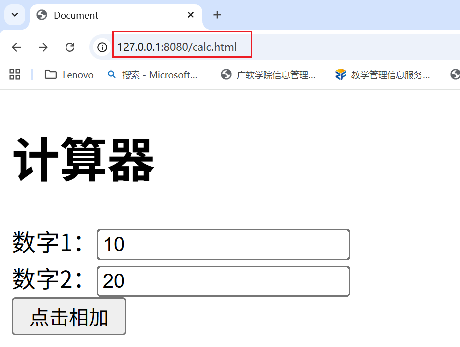 还是要使用 浏览器输入URL 的方式:http://127.0.0.1:8080/calc.html