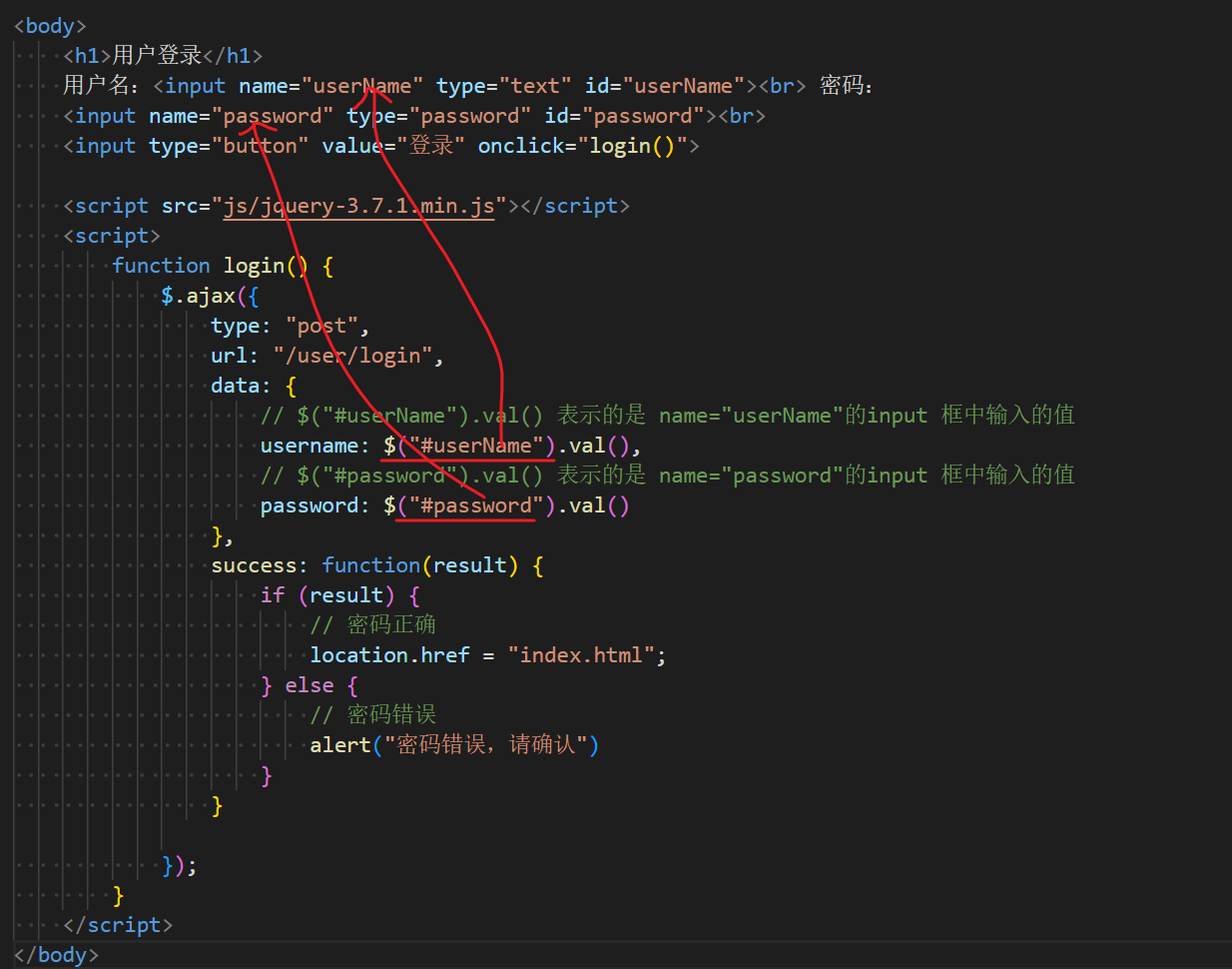 // $("#password").val() 表示的是 name="password"的input 框中输入的值