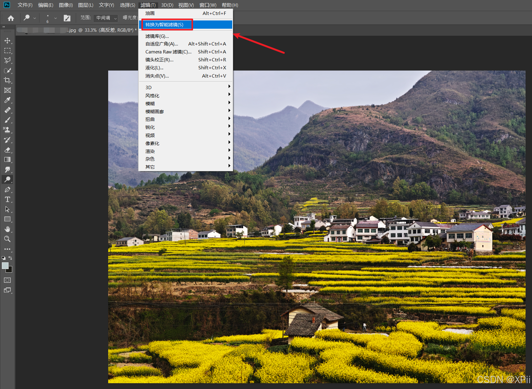 油画图层执行滤镜->转换为智能滤镜命令,将图层转换为智能对象;