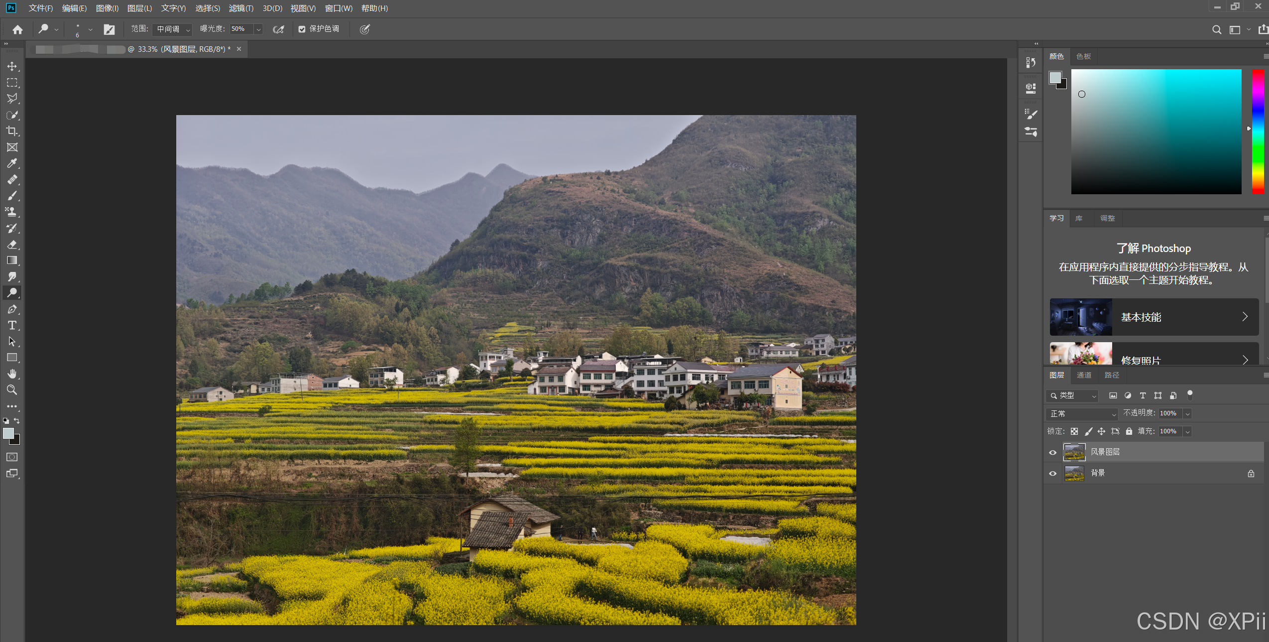 - 调整色阶(2):将复制的背景图层重命名为"风景图层";