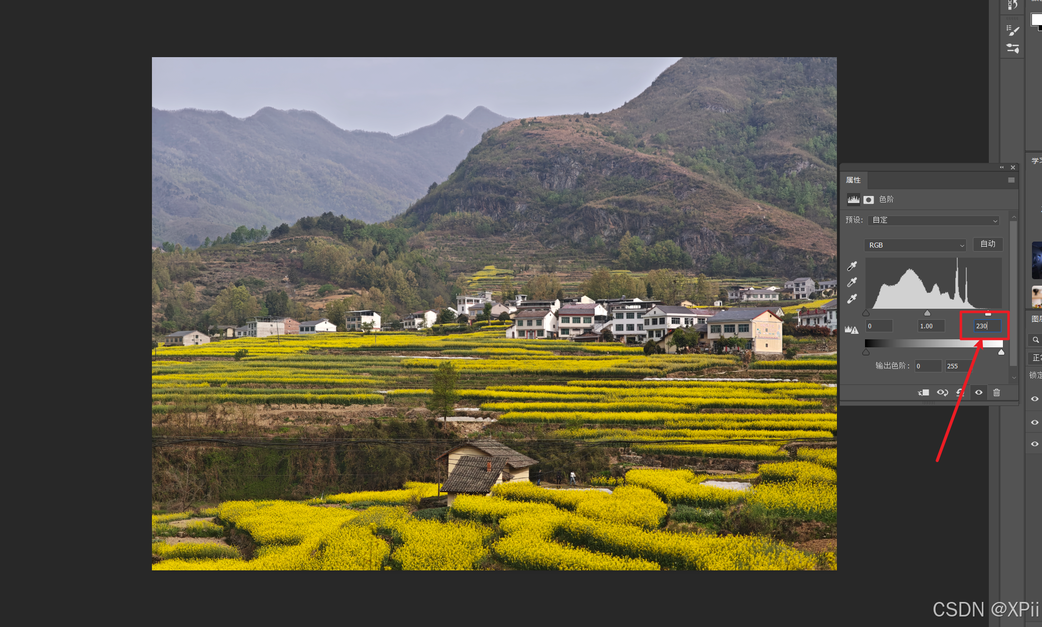 - 调整色阶(4) :在弹出的面板中将右滑块拖到