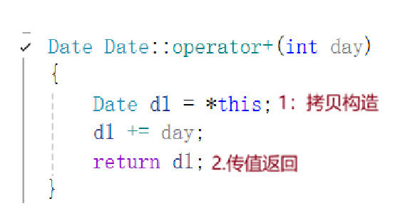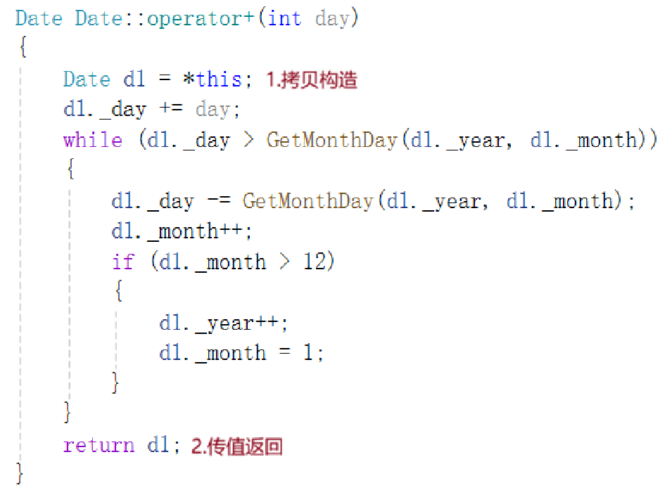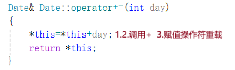 GetMonthDay不做声明和定义分离,因为这个函数必定会被频繁地调用,直接定义在类里面,则默认为内联函数,调用时直接展开,避免建立函数栈帧,提高效率。有了GetMonthDay函数,+=的实现就不难了,实现逻辑如下: