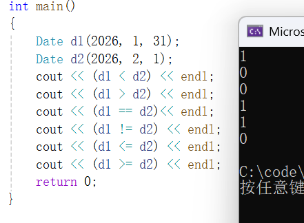 先来看<的实现,两个日期之间作比较需要比较年、月、和日,如果逐个比较过程会非常繁琐,但如果只把<的情况筛选出来并返回true,其他的全部返回false,则会好写很多,代码如下: