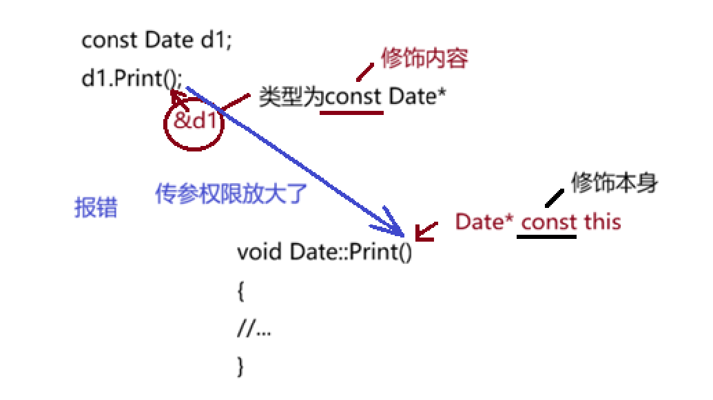 const 修饰Date类的Print成员函数后,Print隐含的this指针变为const Date* const this,缩小了权限,这个时候调用:
