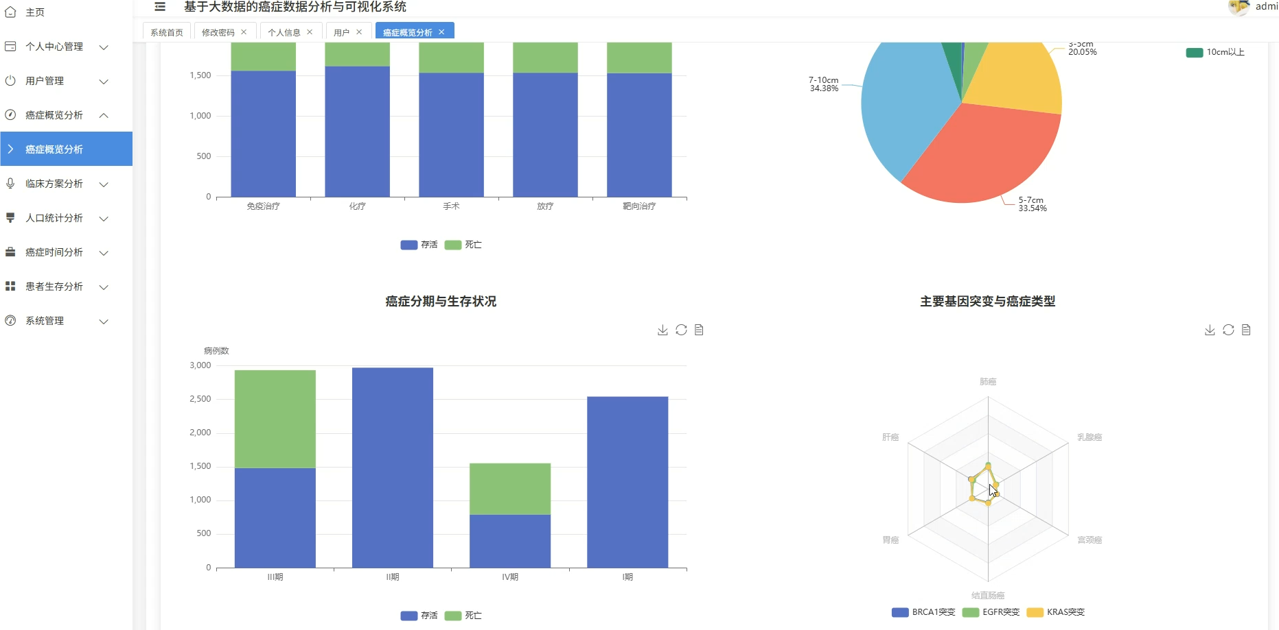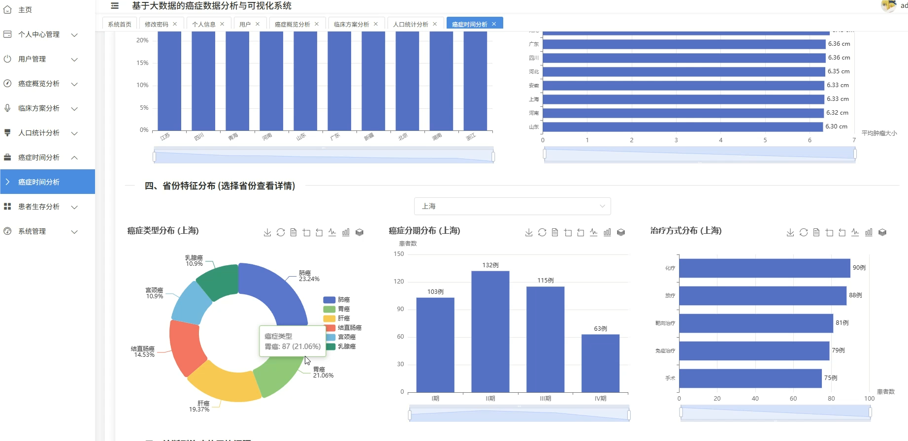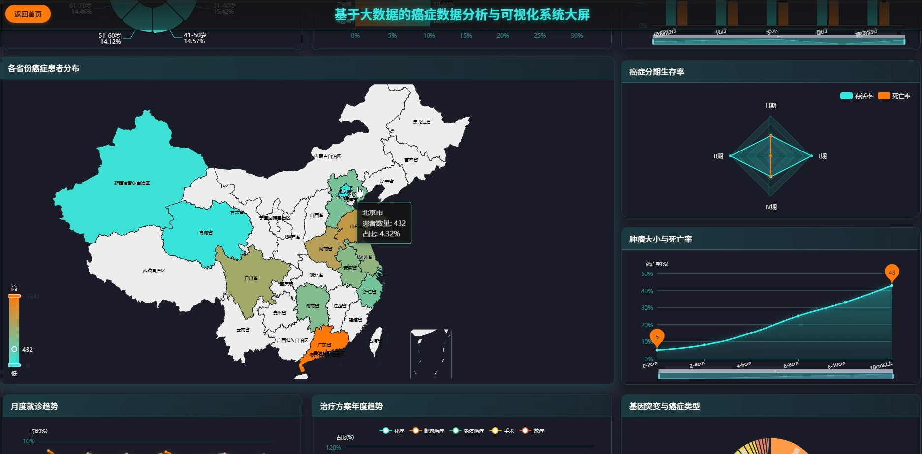 这套系统主要是围绕癌症医疗数据展开的全流程分析平台,核心在于利用大数据技术处理规模较大的临床病例信息,涵盖了从患者人口统计学特征、临床治疗方案到生存预后等多个维度的深度挖掘。系统底层采用Spark作为分布式计算引擎,能够高效处理结构化的癌症数据集,在上层则通过数据可视化技术将复杂的医疗统计结果转化为直观的图表形态,比如不同癌种的地域分布热力图、生存率随时间变化的趋势线等。具体功能模块包括患者年龄性别等基础画像分析、肿瘤分期与治疗方案的关联性挖掘、基于Cox回归的多因素生存风险建模,以及诊断数据的时空模式识别等,整套流程从ETL数据清洗到最终的可视化展示形成了闭环,既满足了医疗数据分析的严谨性要求,又通过大数据技术解决了传统单机处理海量医疗数据时的性能瓶颈。