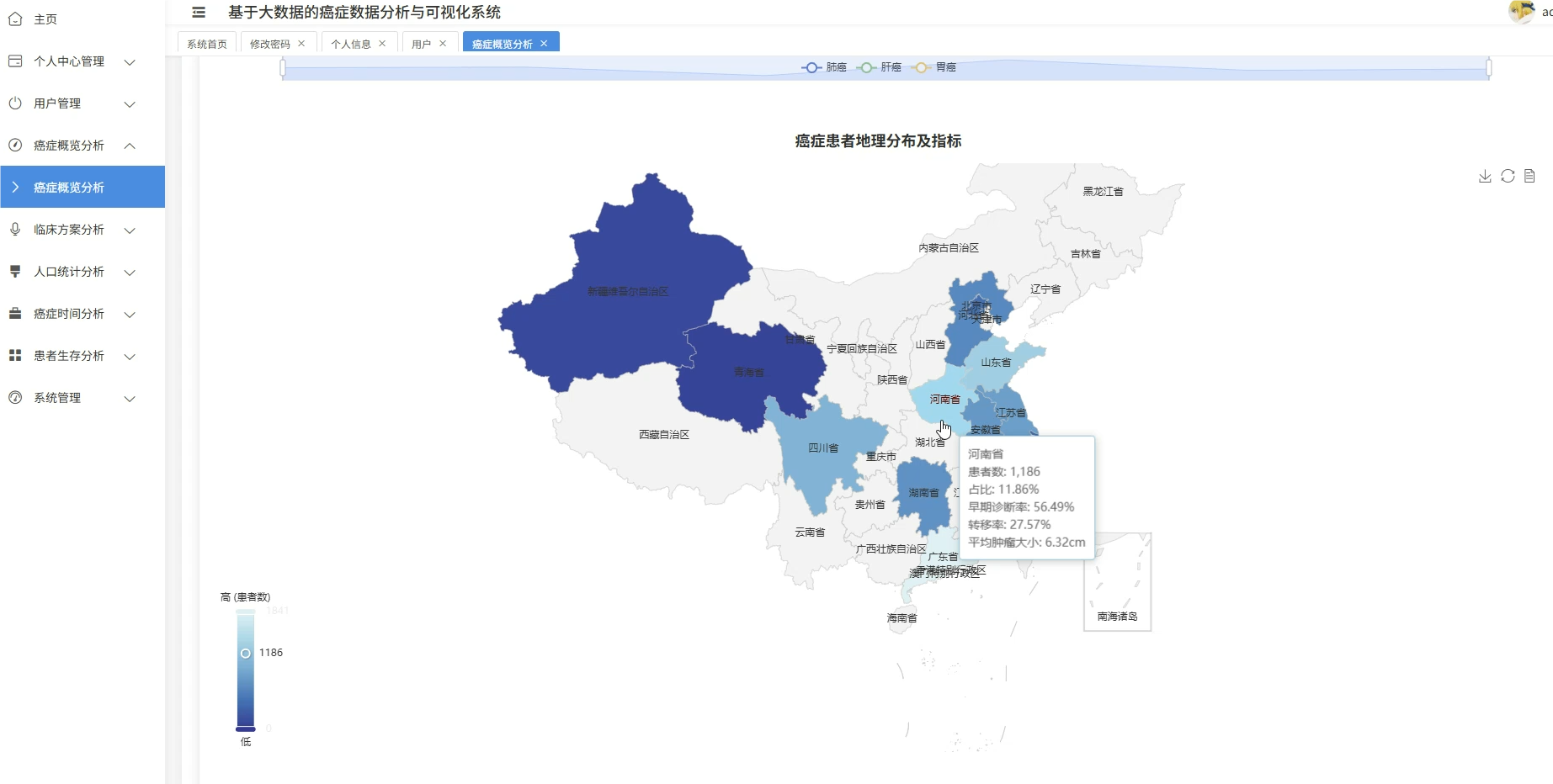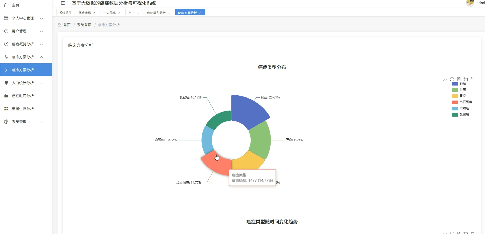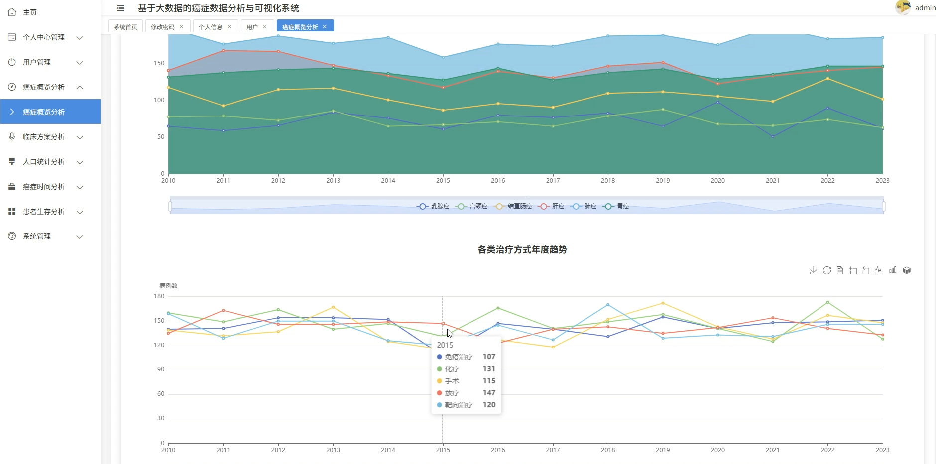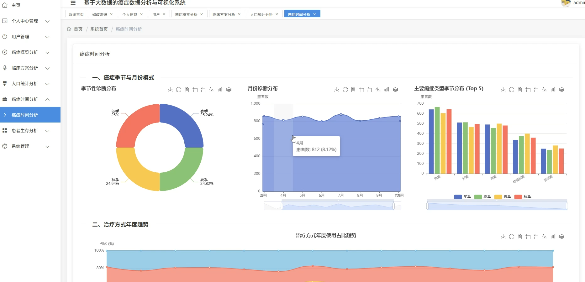 这套系统主要是围绕癌症医疗数据展开的全流程分析平台,核心在于利用大数据技术处理规模较大的临床病例信息,涵盖了从患者人口统计学特征、临床治疗方案到生存预后等多个维度的深度挖掘。系统底层采用Spark作为分布式计算引擎,能够高效处理结构化的癌症数据集,在上层则通过数据可视化技术将复杂的医疗统计结果转化为直观的图表形态,比如不同癌种的地域分布热力图、生存率随时间变化的趋势线等。具体功能模块包括患者年龄性别等基础画像分析、肿瘤分期与治疗方案的关联性挖掘、基于Cox回归的多因素生存风险建模,以及诊断数据的时空模式识别等,整套流程从ETL数据清洗到最终的可视化展示形成了闭环,既满足了医疗数据分析的严谨性要求,又通过大数据技术解决了传统单机处理海量医疗数据时的性能瓶颈。