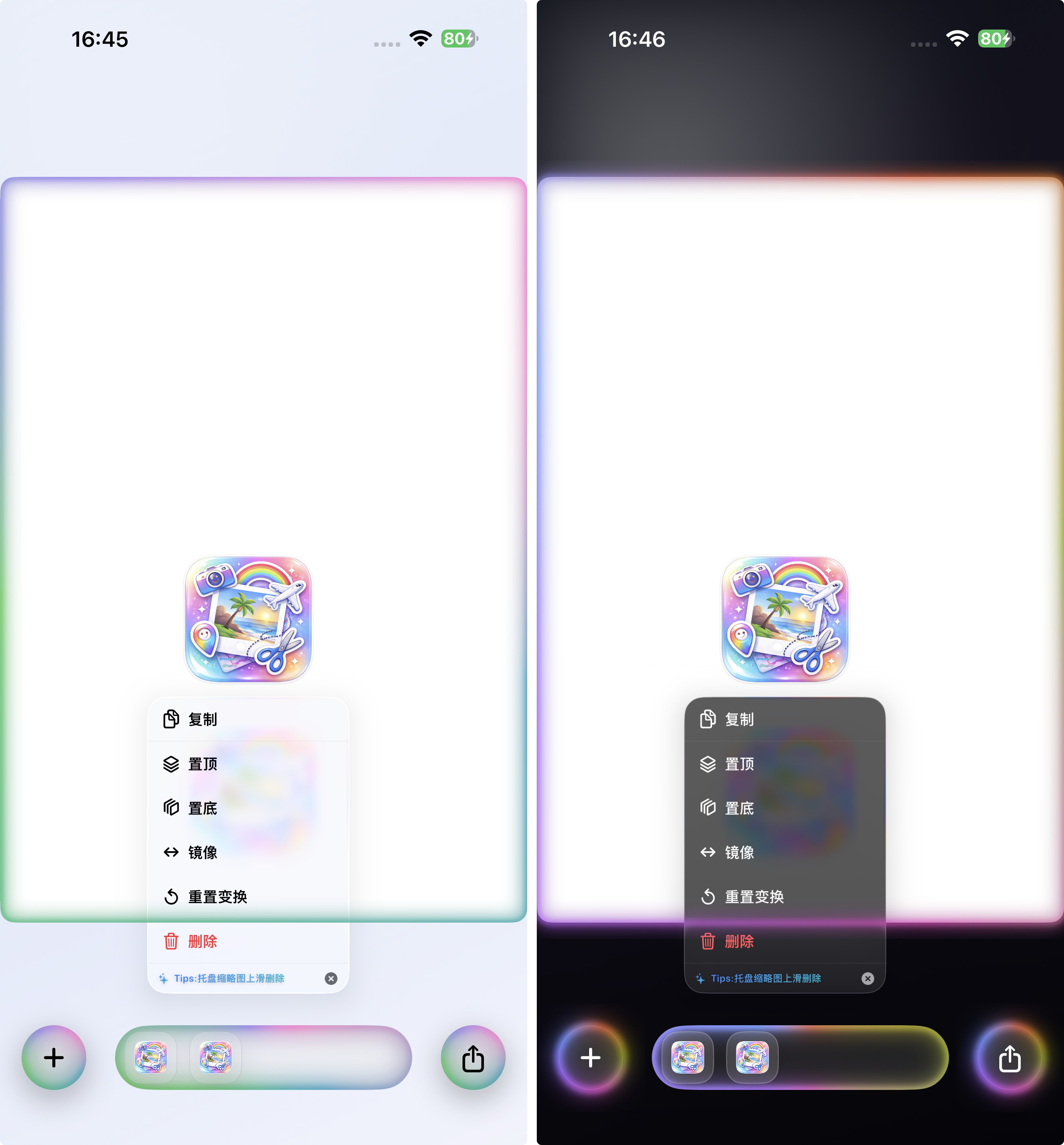SnipTrip 是一款 iOS 贴纸拼贴与画布编辑应用:从照片中生成贴纸、放置到 A4 画布上进行拖拽、缩放、旋转编辑,并支持导出与分享。界面采用液态玻璃质感与 Apple Intelligence 风格光晕,强调可交互区域与视觉层级,并在深浅色模式下保持统一的质感与辨识度。
