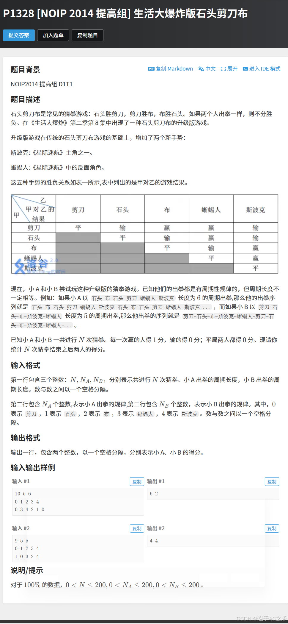 题目: P1328 [NOIP 2014 提高组] 生活大爆炸版石头剪刀布