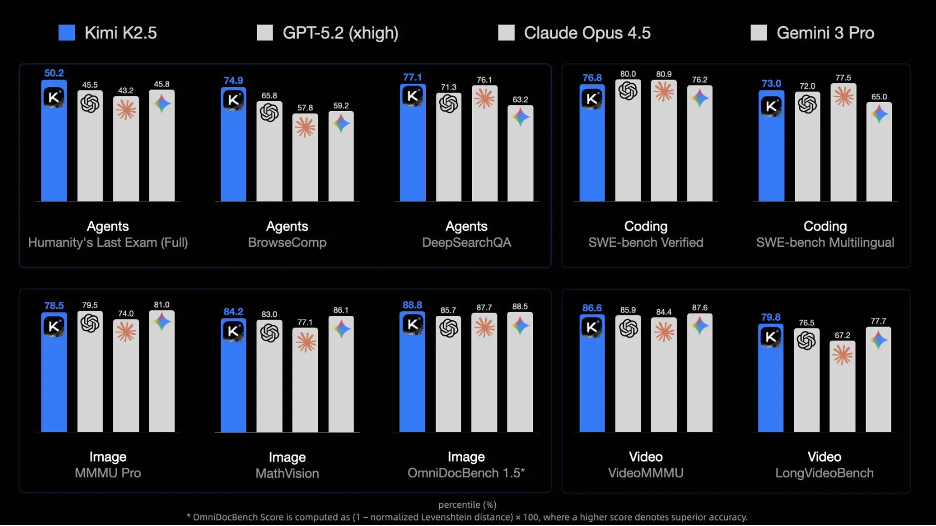 2026年1月27日,月之暗面技术有限公司(MoonShot AI)正式发布Kimi K2.5,它是迄今为止 Kimi 最智能的模型,在 Agent、代码、视觉理解以及一系列通用智能任务中实现了开源的最先进性能。