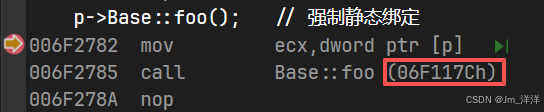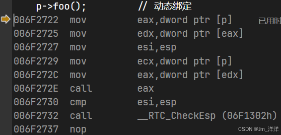 还是使用的上述案例,可以看到先通过指针p找到对象的起始地址,在对象的虚函数表中找到foo函数地址,最后调用;