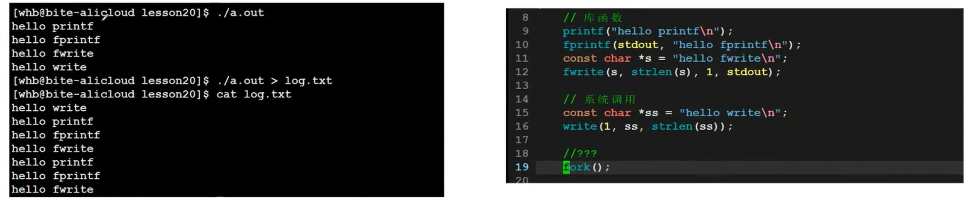 当库函数和系统调用作用于普通文件时(第二次调用)库函数实现的缓冲区满刷新,因此当到fork()函数时,缓冲区还没有刷新,所以写入了两遍。