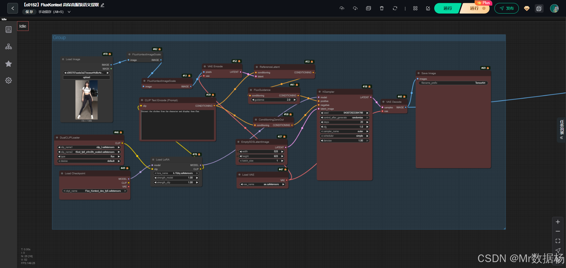 今天给大家演示一个 FluxKontext 高保真服装语义提取的 ComfyUI 工作流。它的作用是从人物图像中提取服装结构,并把衣服内容以平铺方式清晰展示。整个流程依靠 Flux 系列模型、Kontext 图像尺度处理、参考潜空间、文本编码和引导控制来完成。从加载原图到处理潜空间,再到语义抽离与最终输出,整个链路保持高精度,适合做服装解析、设计参考和生产素材采集。