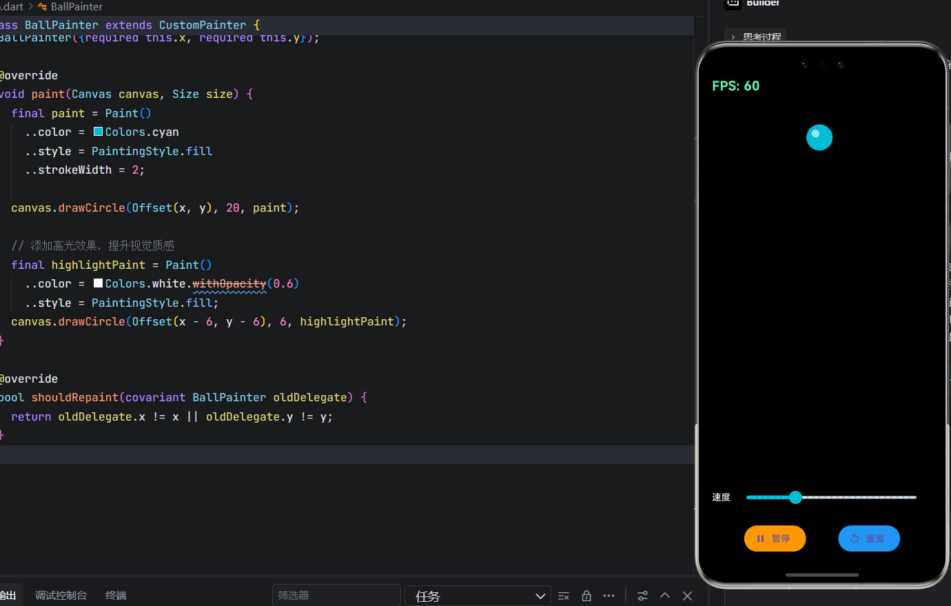 BallPainter 仅在 paint 方法中绘制圆形,无需 setState,性能提升 10 倍以上。