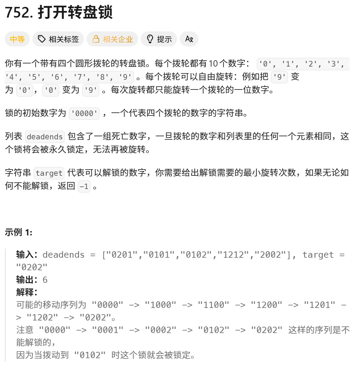 print("Minimum moves to unlock:", solution.openLock(deadends, target)) # 输出: Minimum moves to unlock: 6