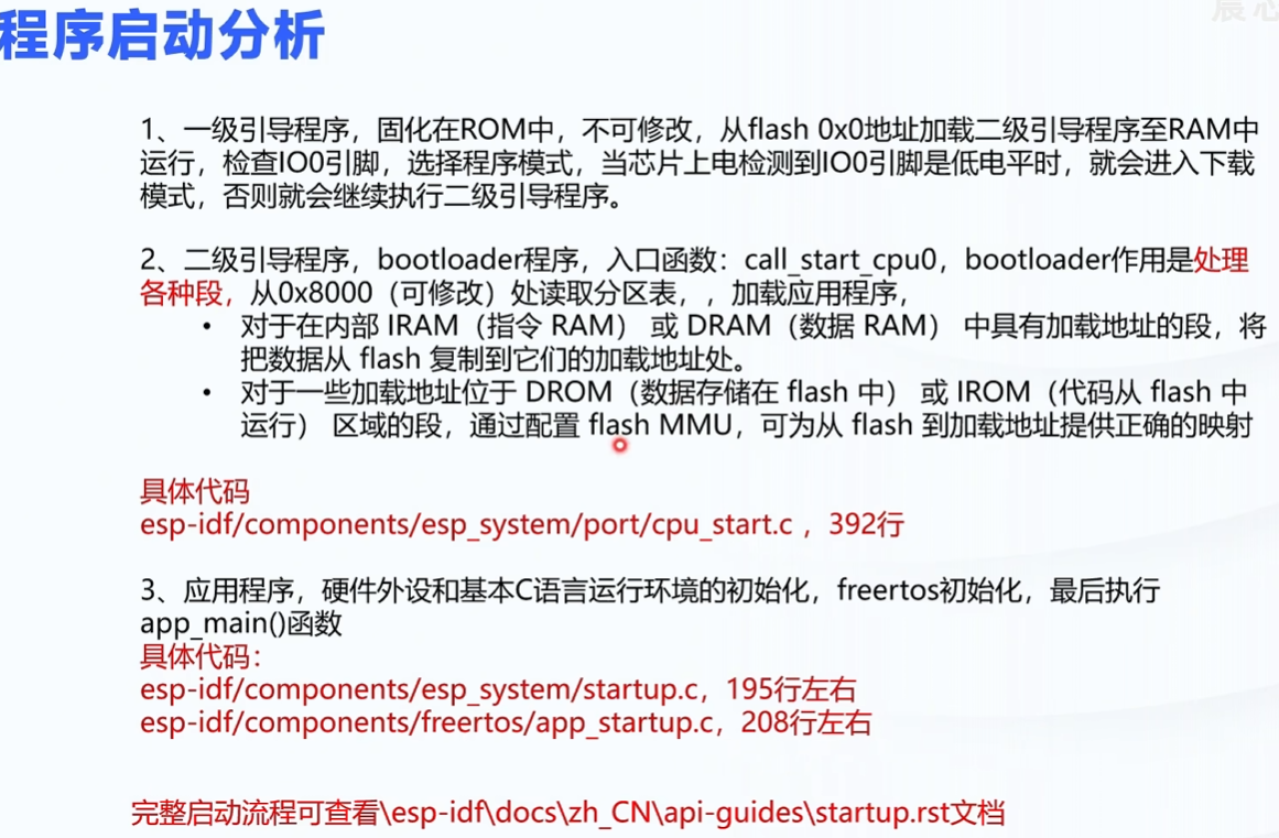 app_main的使用、动态内存的分配、任务的创建,底层的启动流程由 IDF 自动处理; - 对深入开发:需要理解 Flash 二级引导的配置、内存映射的段加载规则、双核的运行机制,才能开发低功耗、大内存、高安全性的项目;