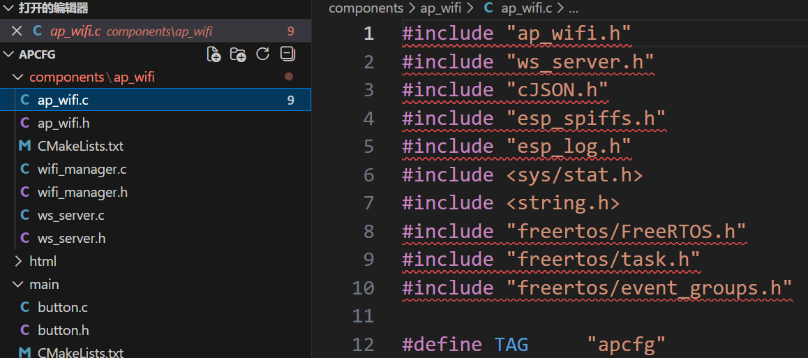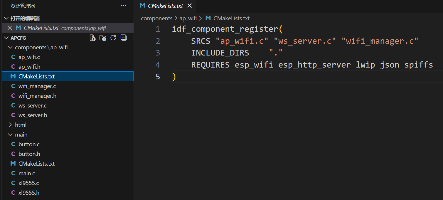 在ap_wifi文件夹下的cmakelist中我们包含了三个源文件"ap_wifi.c" "ws_server.c" "wifi_manager.c",如果我们在这三个源文件中引用了组件的头文件