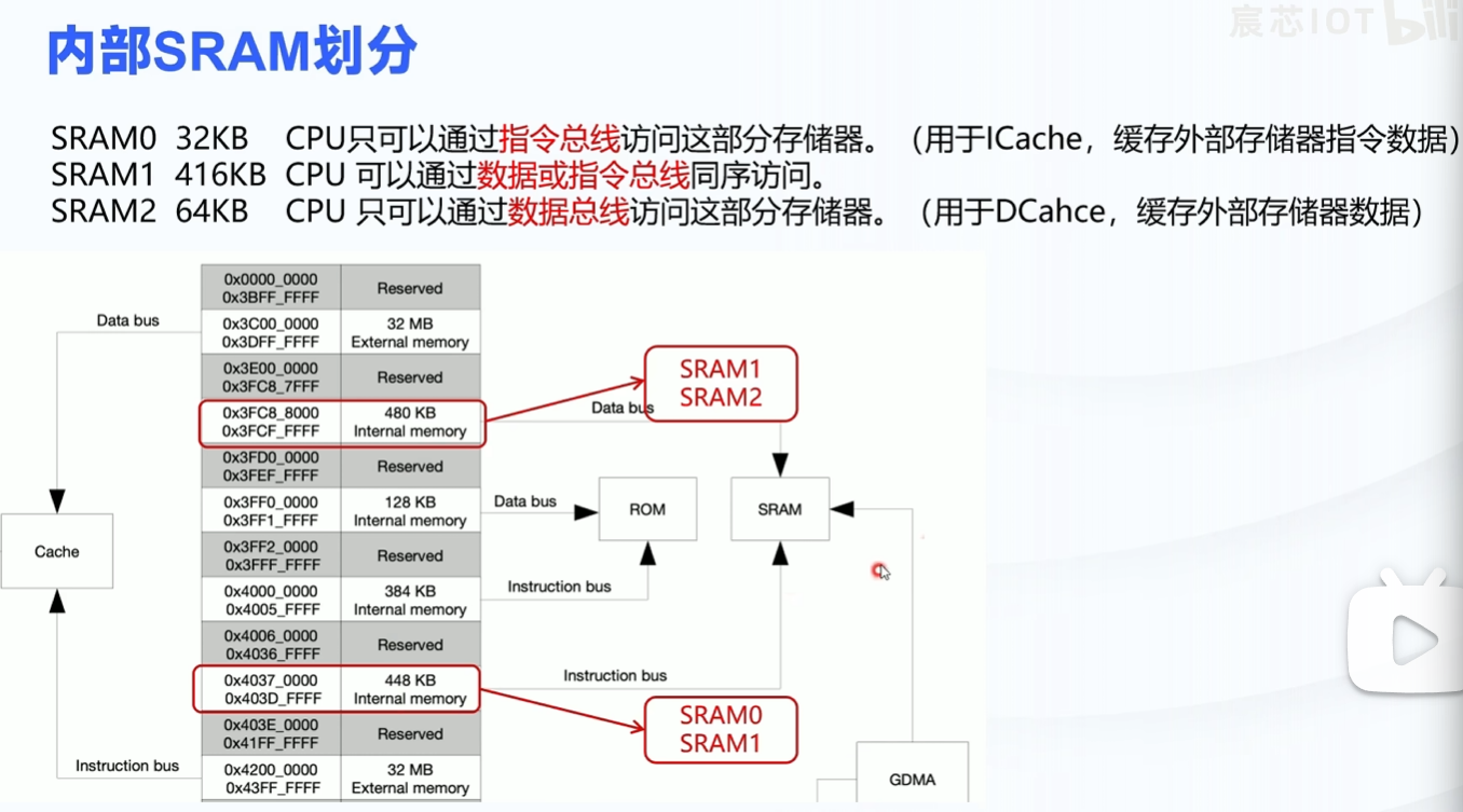 80KB | 数据总线 | 内部 SRAM | 存放动态数据(堆、栈、全局变量) | ESP-IDF 默认malloc的分配区域 |