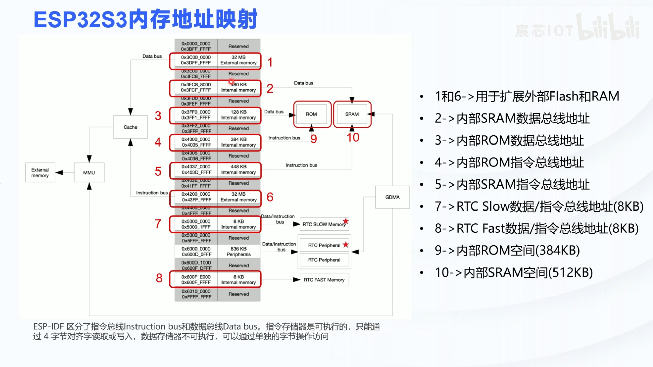 32MB | 数据总线 | 外部内存(Flash/PSRAM) | 存放大容量数据或溢出代码 | 需 MMU 映射,配合 Cache 加速 |
