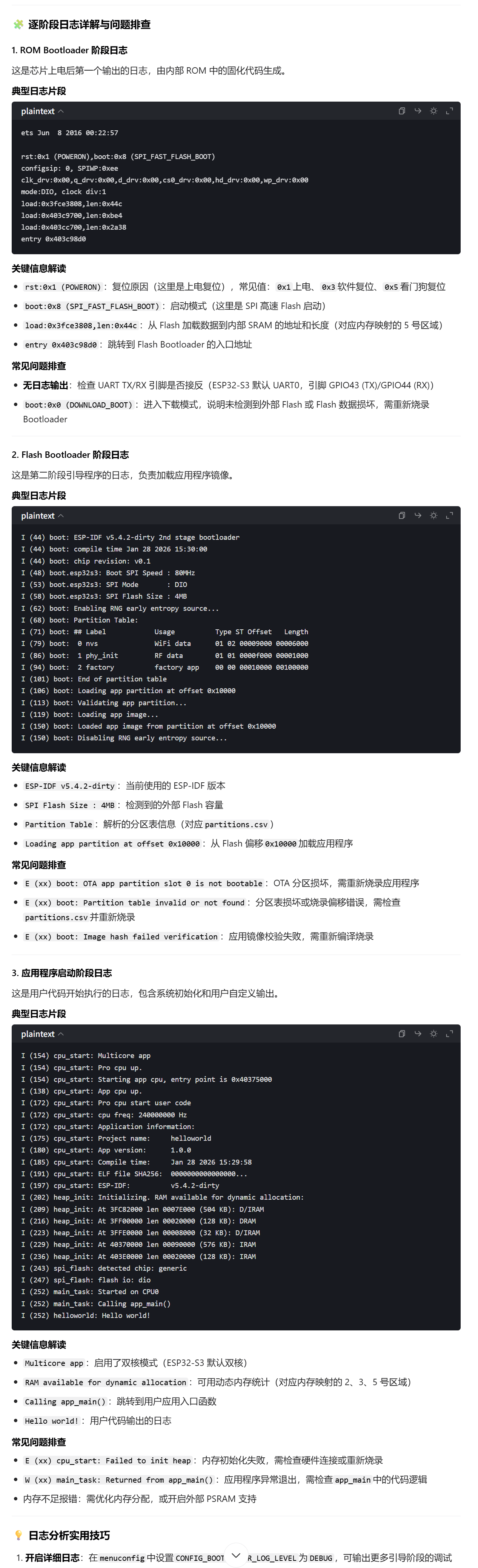 | ROM 一级引导 | 4 号(ROM)、5 号(IRAM) | 无(波特率 74880) | 1-5 步(上电→加载二级引导) |