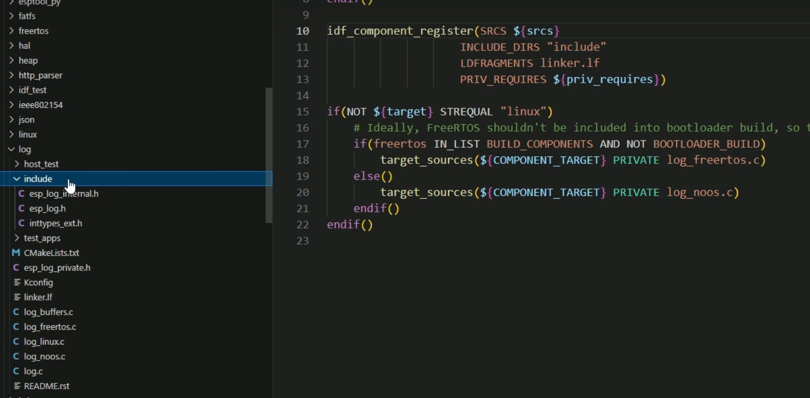 我们可以看到,再cmakelist里面是最主要的就是idf_component_register这句代码,这句代码把组件注册到了项目里,SRCS指定了组件包含的源文件,INCLUDE_DIRS指定了要包含的头文件目录,图中的include实际上就是左侧log文件夹下的include文件夹