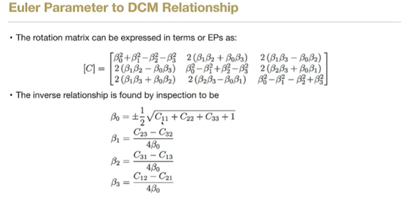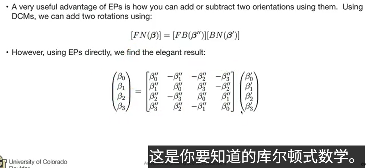 - 重要特性非唯一性(双倍覆盖):同一姿态可以用 qqq 或 −q-q−q 表示。几何意义:一组代表优弧旋转(长路径),另一组代表劣弧旋转(短路径)。无奇异性:与欧拉角不同,四元数在任何姿态下都没有奇异点(不会出现死锁)。约束条件:必须满足单位范数约束:β02+β12+β22+β32=1\beta_0^2 + \beta_1^2 + \beta_2^2 + \beta_3^2 = 1β02+β12+β22+β32=13. 工程与控制应用归一化(Normalization):在数值积分(如 RK4 算法)过程中,由于舍入误差,四元数的模长会偏离 1。策略:通常在每个积分步结束时,手动将矢量除以其范数,使其重新回到超曲面上。