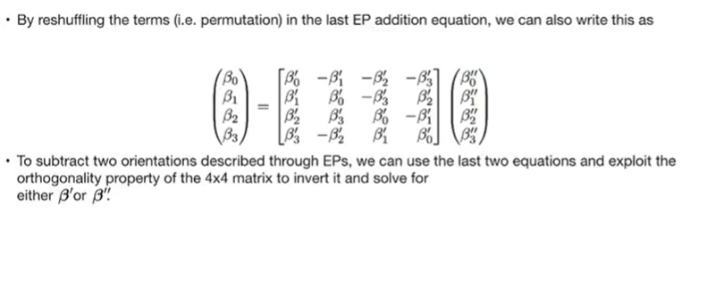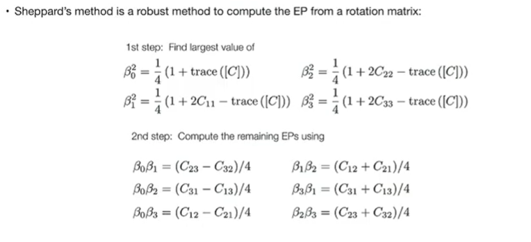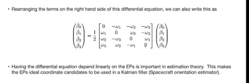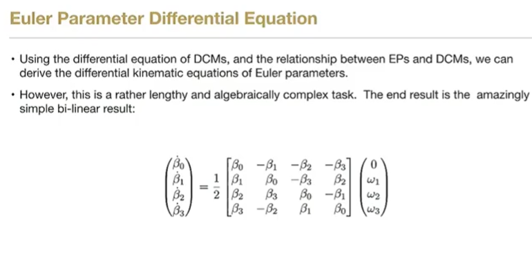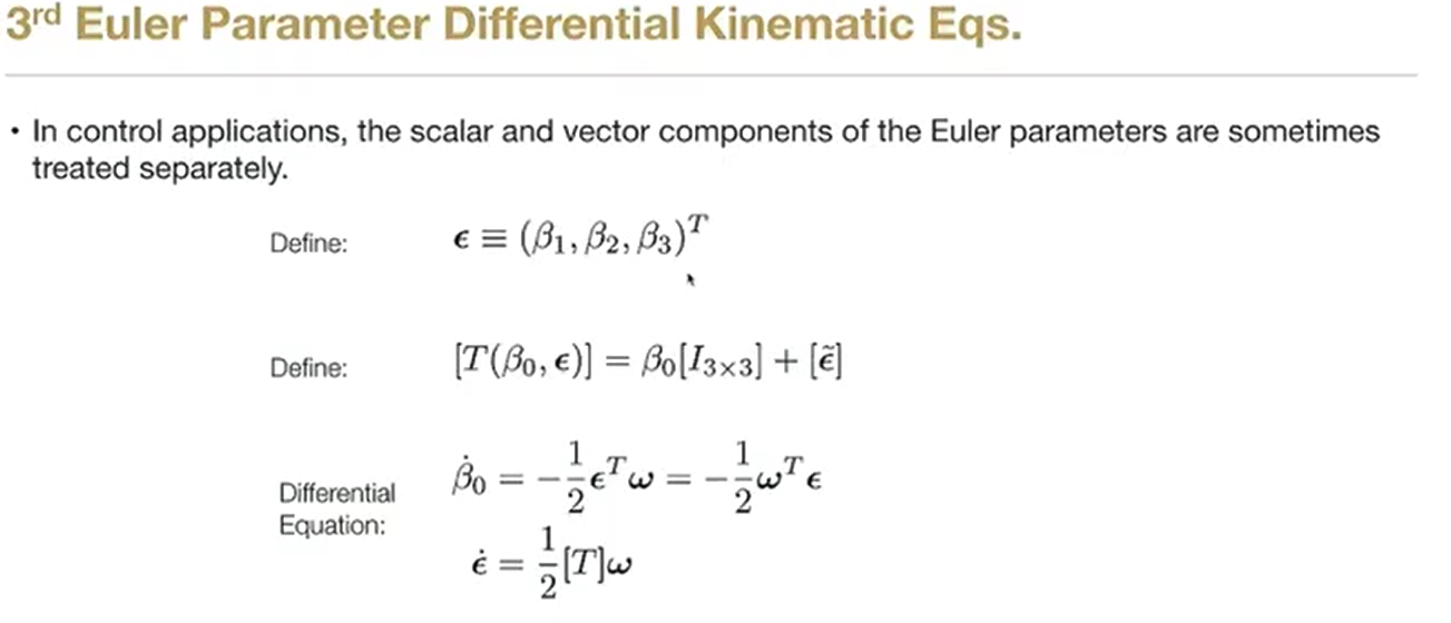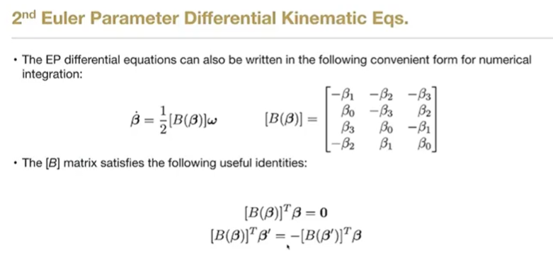 - 运动学方程微分方程:β˙=12[B(β)]ω\dot{\boldsymbol{\beta}} = \frac{1}{2} [B(\boldsymbol{\beta})] \boldsymbol{\omega}β˙=21[B(β)]ω。矩阵特性:通过在 3x1 矩阵前补 0 构造出的 4x4 矩阵具有正交性,便于数学求逆和变换。