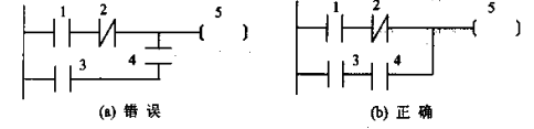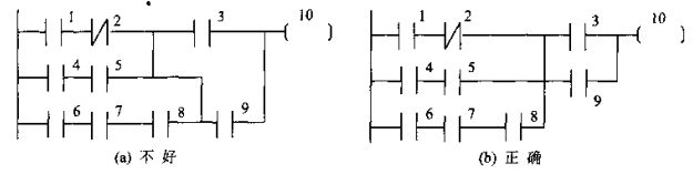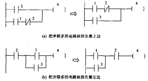 - 串联多的电路块靠上:在并联电路中,应将串联触点较多的支路安排在梯形图的上方(如图a部分所示)。这样布局可以减少指令条数,使逻辑更清晰。