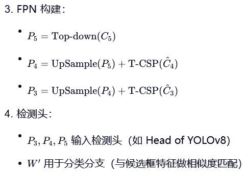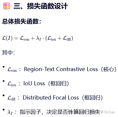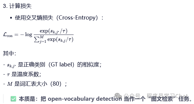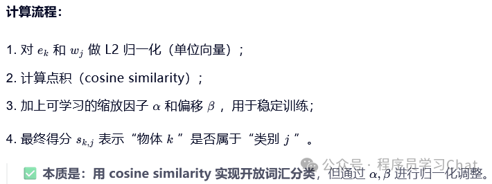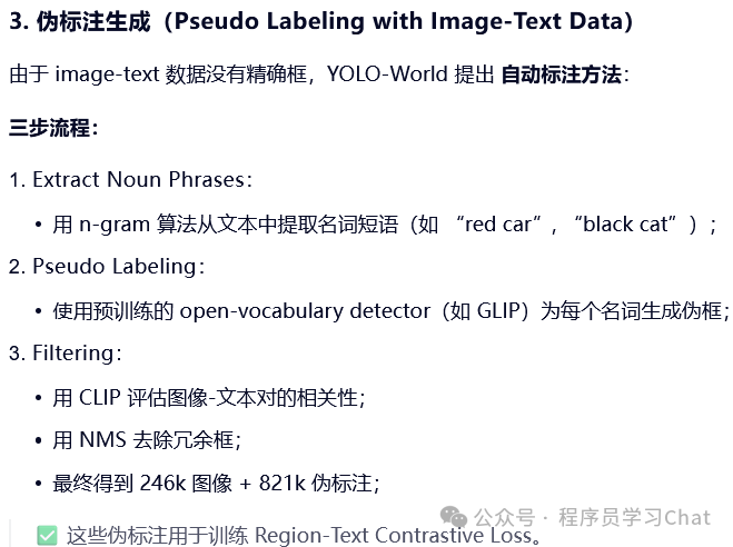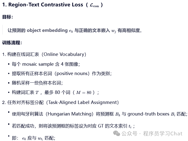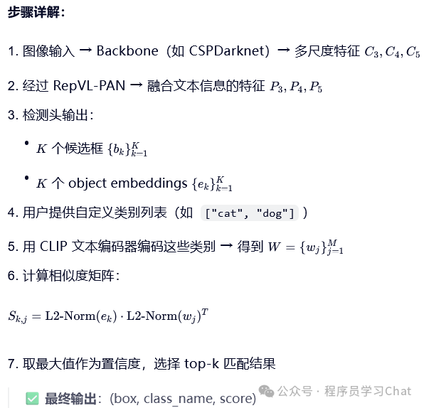 将图片输入到YOLO的Backbone中进行图像特征提取,将类别文本输入到Text Encoder中进行文本编码特征提取(论文中使用的Text Encoder是CLIP),利用Vision-Language PAN进行图像特征、文本编码特征的语义对齐,将语义对齐后的特征输入到Text Contrastive Head、Box Head中得到预测类别和矩形框坐标输出,和真实标签计算损失反向梯度传播训练整个YOLO World。