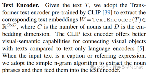 利用CLIP对输入的文本类别列表,如[cat,dog,apple],进行特征编码表示,得到[C,D]大小的编码表示矩阵,其中C是类别的个数、D是文本特征编码表示的嵌入向量维度。如果输入的是一整段的文本,则利用n-gram方法从文本中提取出文本类别列表,再进行特征编码表示,比如输入的是"a cat and a dog eat apple",需要借助n-gram方法从这段文本中提取出来要检测的类别名词,然后形成类别名称列表再输入到CLIP中进行特征编码表示。